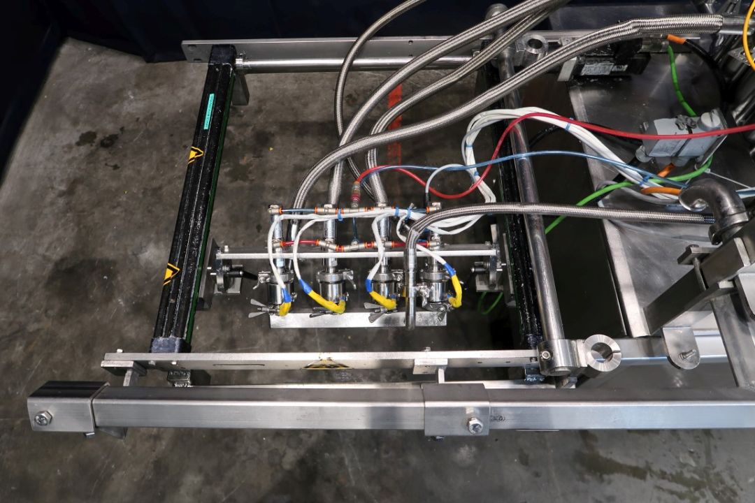 4 heads. Piston doser 10 - 50 ml for hot processed cheese to be mounted on top of a filling machine. Distance between pistons now : 10 cm. Agitator in hopper to keep hot product moving and prevent sticking to side. Double jacketed hopper with electric heating element for heating the jacket. Cleaning in cip possible. Own control panel with touch screen panel. Total dimensions: 260 x 120 x 240 cm.