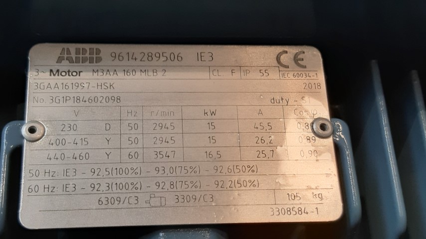 Three phase motor for a wide variety of applications; pumps, fans and process machinery drives. ABB M3AA induction 15 kW - 31,4A - 2928rpm 400V 3-phase. Shaft diamtater: 41mm Shaft length: 105mm. It has a top mount terminal box. Total dimensions: 57 x 35 x 37cm