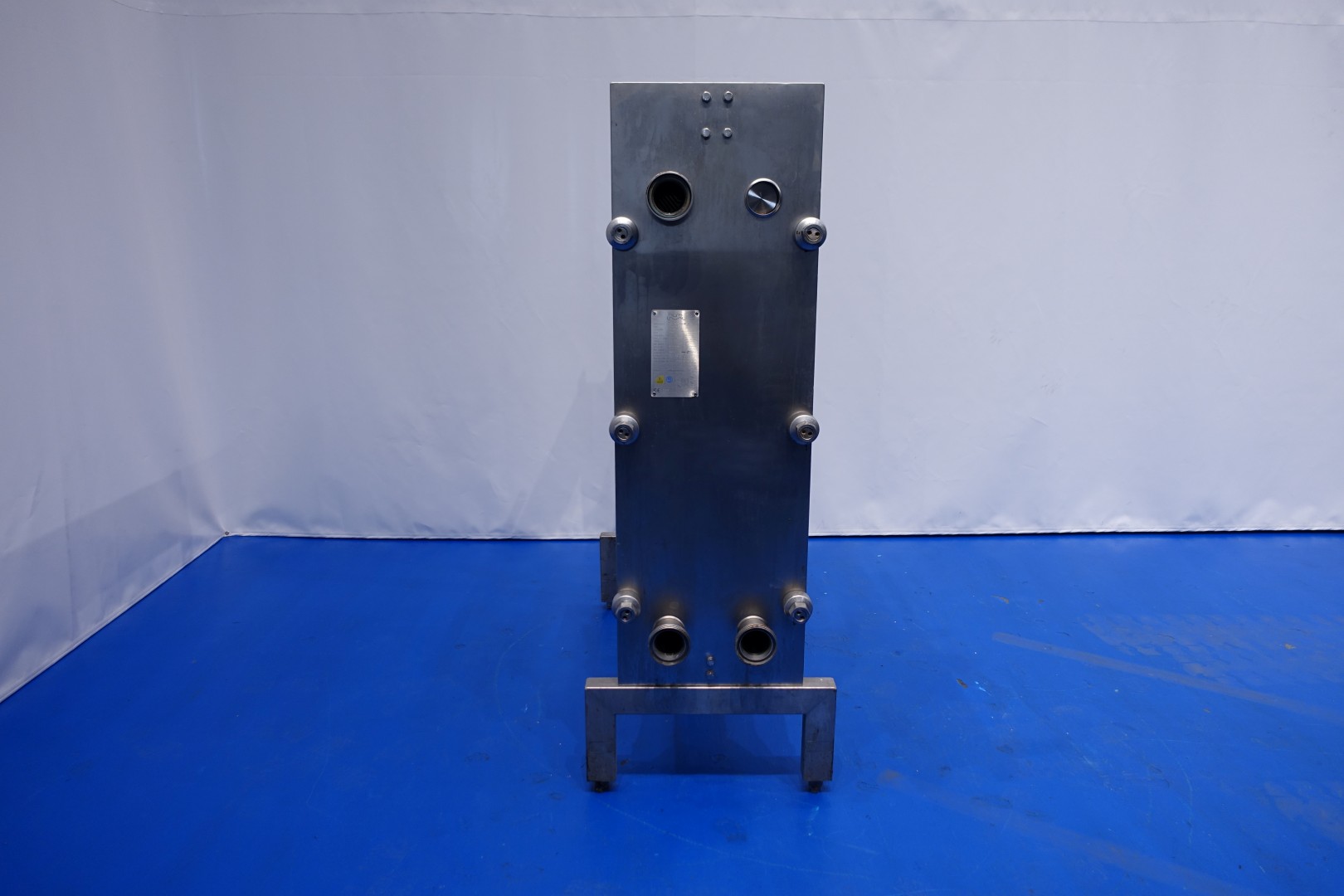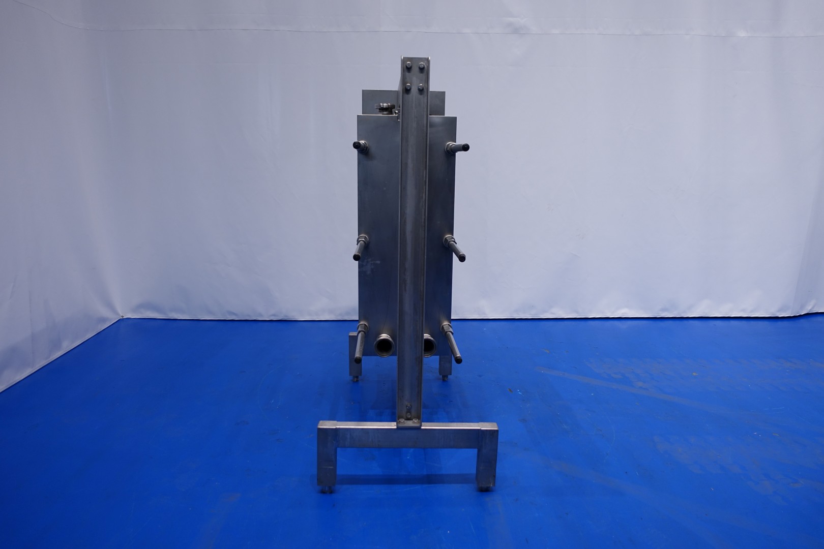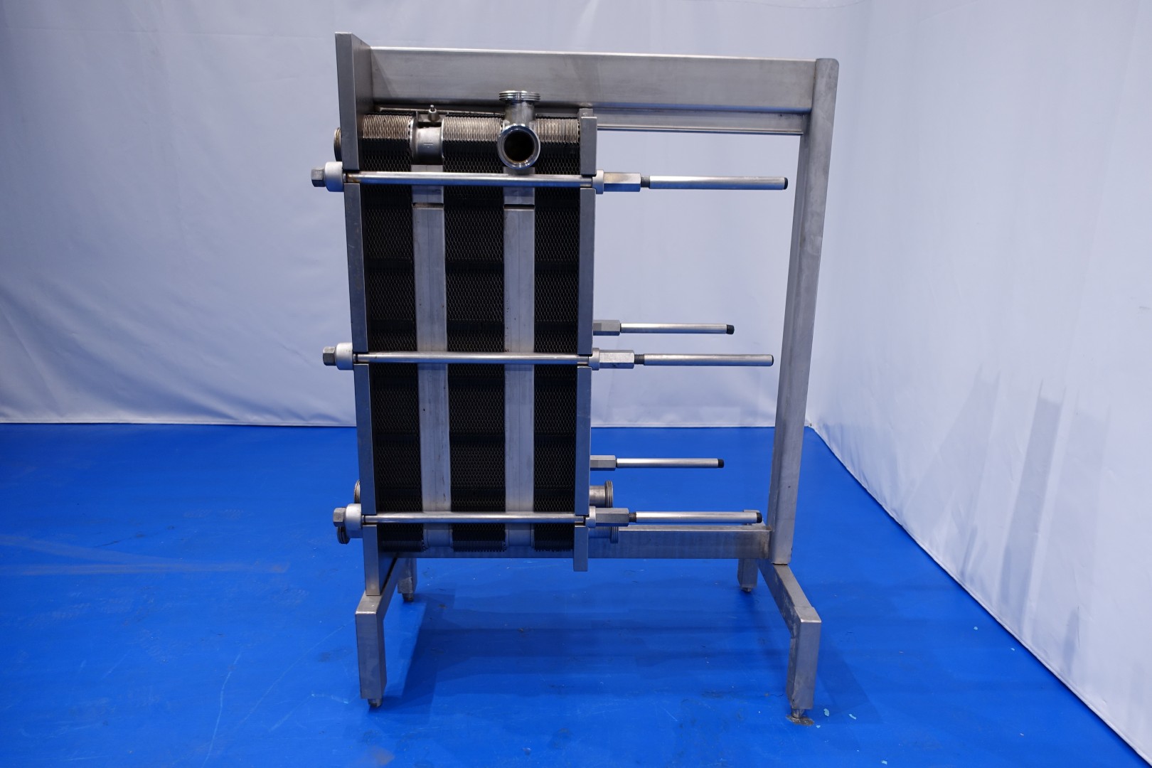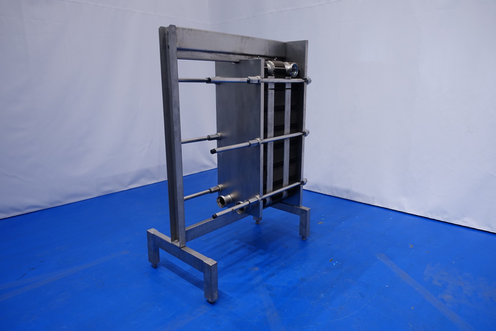 Plate heat exchanger, sanitary (PHE). Pressure: 10,0 bar - Beam length: 120 cm, connections: 8 x 3" DIN. Current configuration: 3 Sections: 25-32-24 plates (total 81) - Connections head: 1 up and 2 down, follower 2 down.