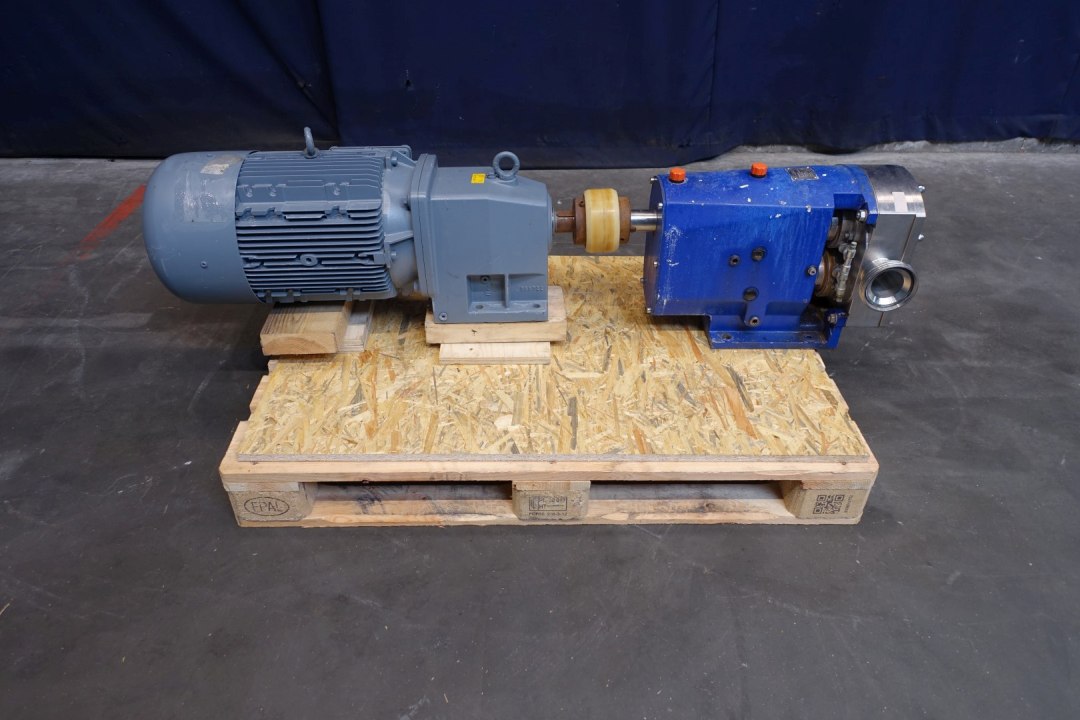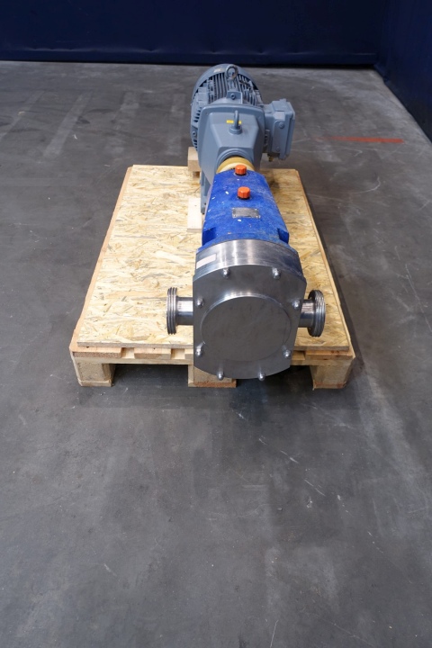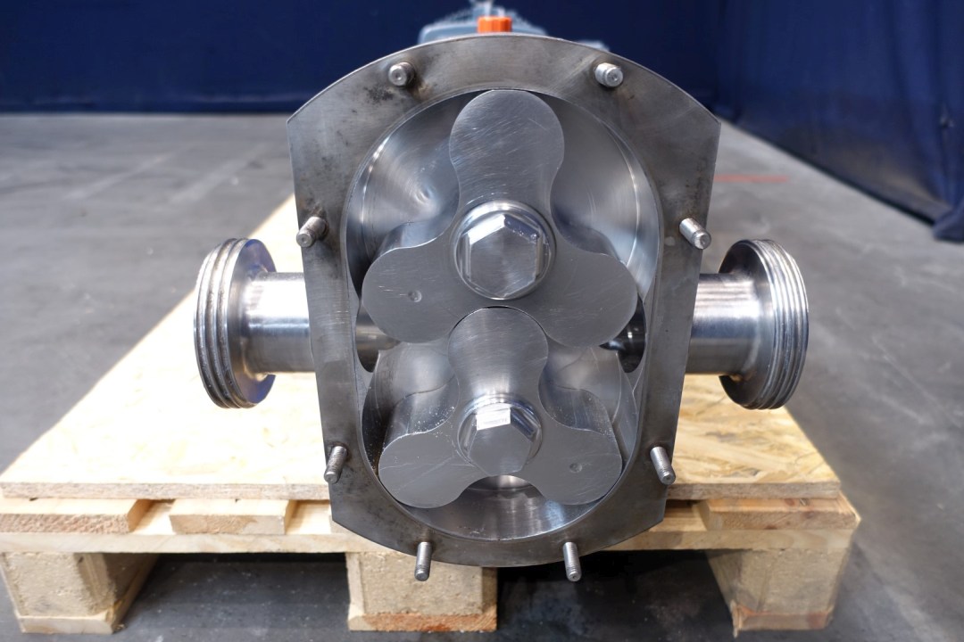 Lobbe pump with tri stainless steel lobbes. Diameter lobbes: 160 mm. Displacement per revolution: 1,16 ltr. Nominal capacity 10 m3/h. Current drive work: motor: 15,0 kW - 27,9 A - n1: 1.465 rpm, i= 10,2 - n2: 144 rpm. Design pressure up to 20 bar. Connections: (in) 2,5" / (out) 2,5" DIN. Dimensions: 150x38x40 (lxwxh) cm - weight: 358 kg's.