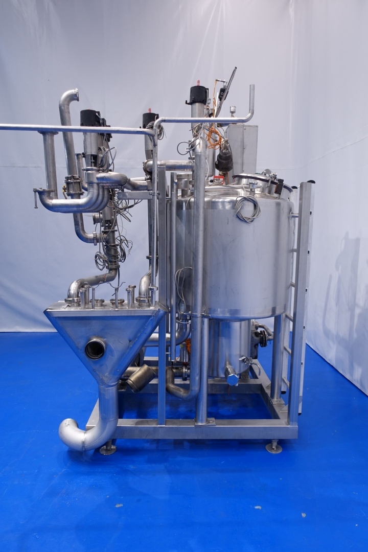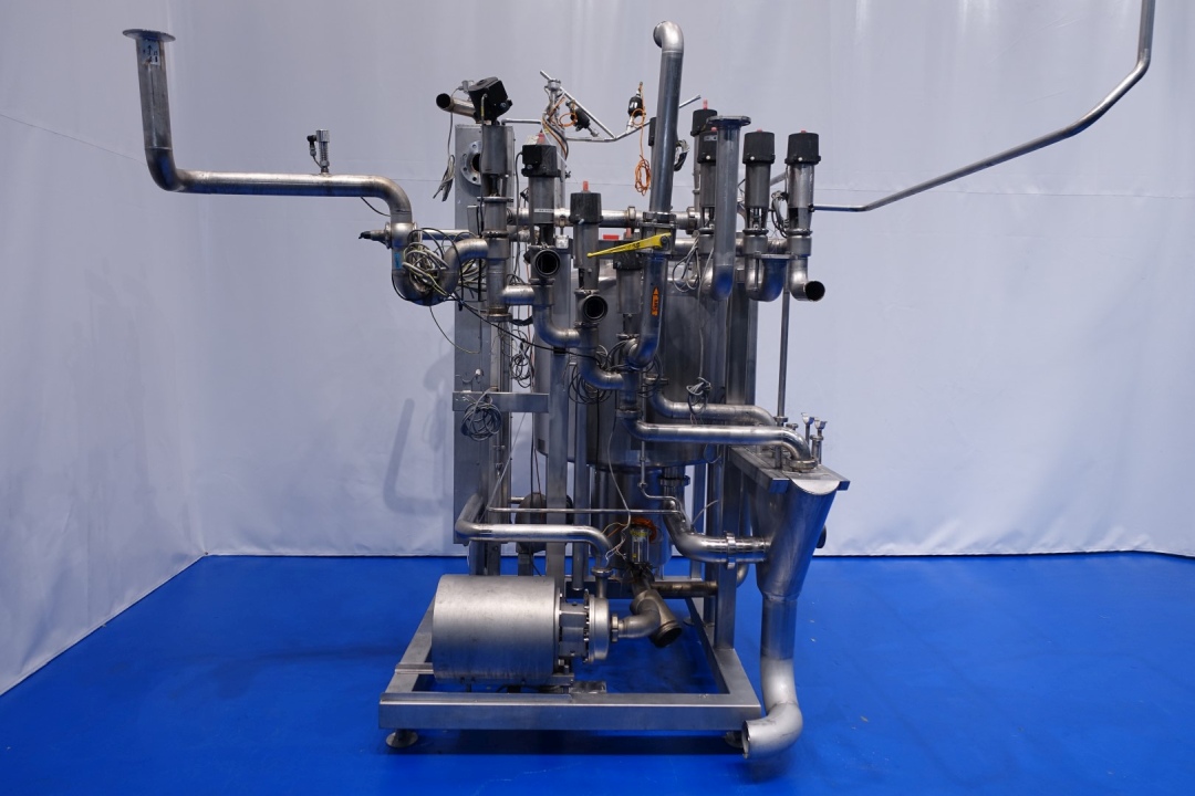 Skid mounted Cip unit, Which includes all items to make a CIP unit except the lye and acid storage tanks. included is a Balance vessel, CIP+ Centrifugal pump, Tubular heat exchanger to heat up the cleanig detergent, 2 x Siemens mag flow transmitter, valves and piping. The balance vessel, has a capacity of 500 ltr, 2 x cip spray bowl, Temp sensor and level sensor. The CIP + pump is an Alfa Laval model: LKH-20/165 centrifugal pump - 5,5 kW - 10,7 A - 2.880 rpm - impellor Ø 165 mm - Connection in: 2,5" Din - out: 2,0" Din, capacity: 25m3 up to 3,5bar or 50m3 up to 2,5bar. inline Filter and an insulated Spira flow mulittube tubular heat exchanger. The return line with conductivity transmitter and return water collecting vessel connected to side of skid for sending the return flow to the drain. Total dimensions 190x175x275 (lxwxh) cm - weight: 660 kg.