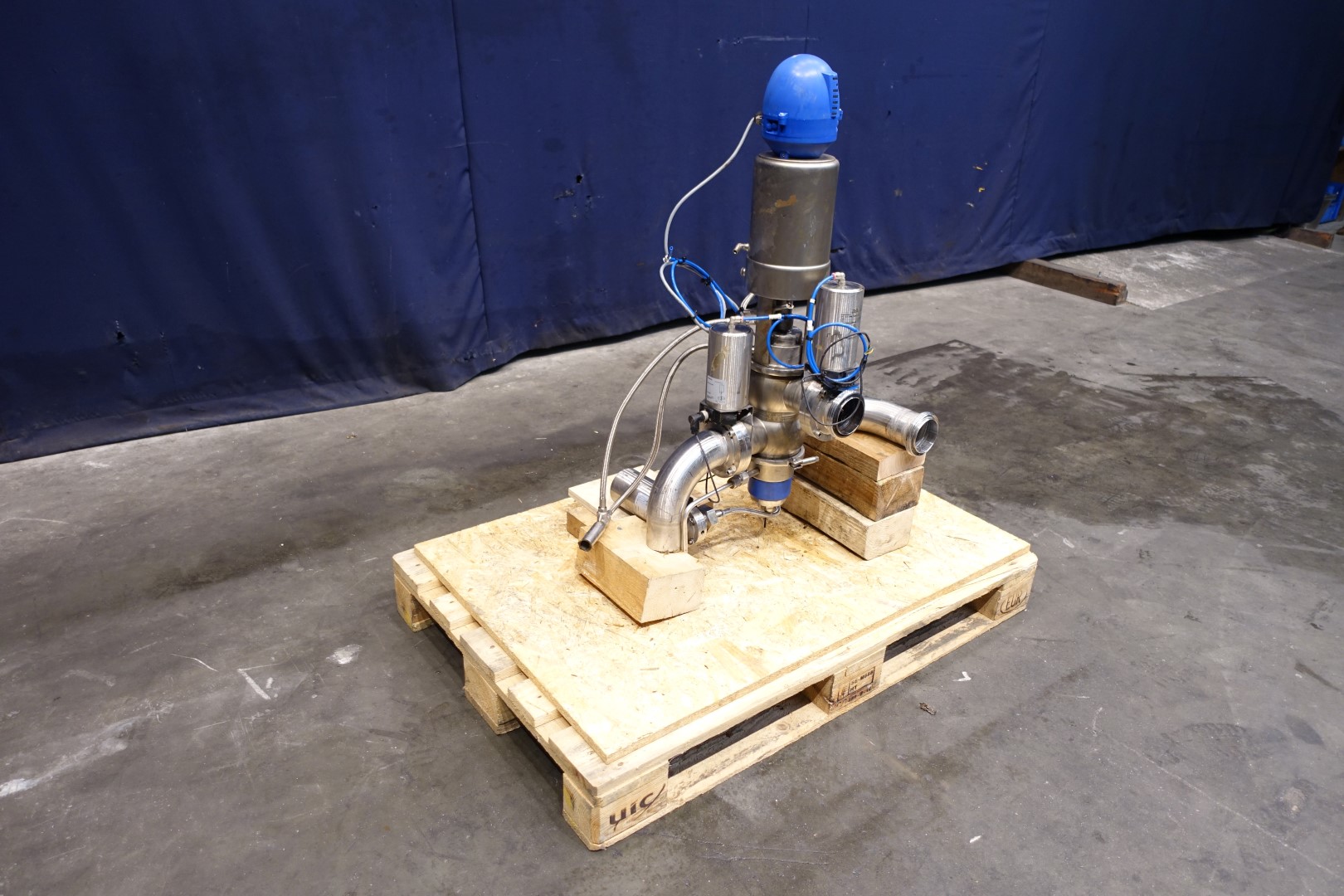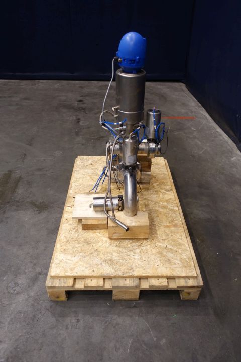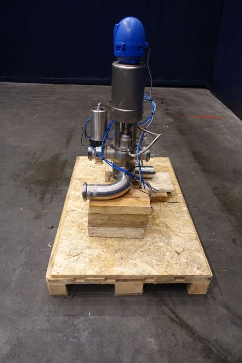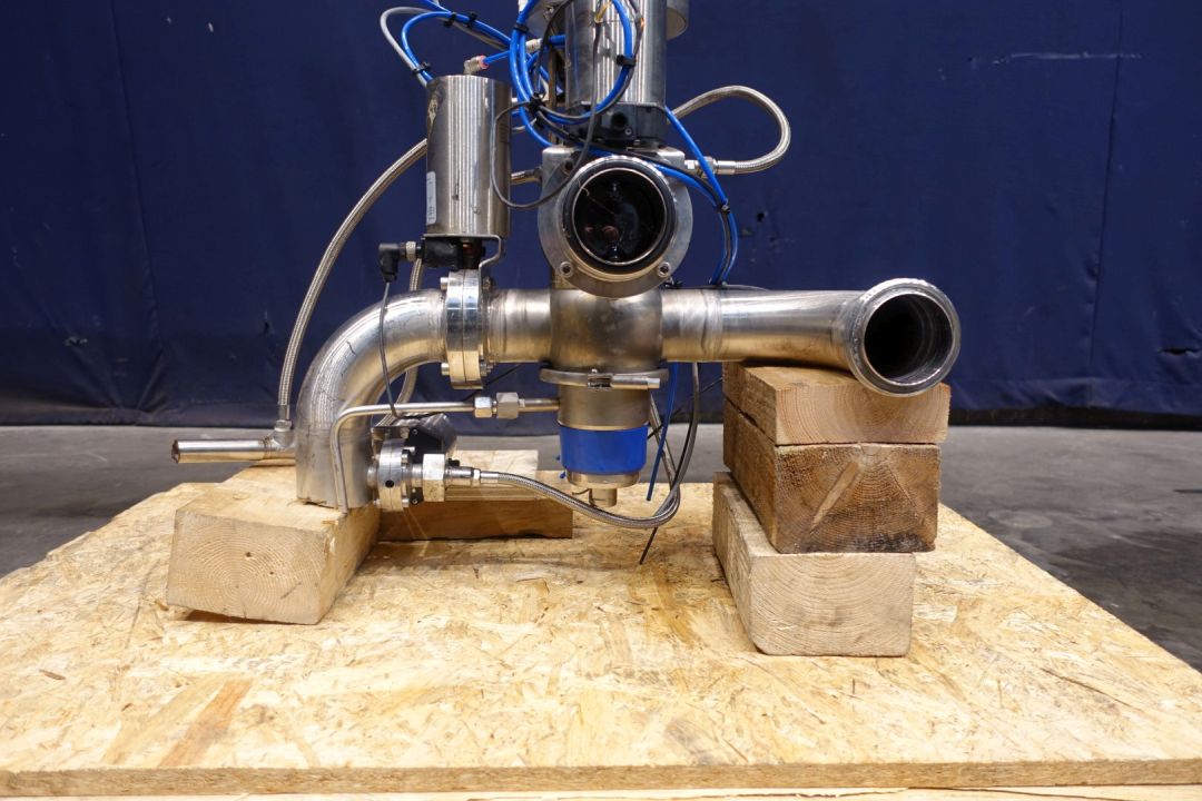 Mixproof valve with seat lift and clean flush spray connections, with Think top position sensors. The unit is a complete mix proof cross point including 2 x Butterfly valve (LKLA) for product/cip 1 x butterlfly valve for cleaning to flush point dn25 (LKLB) with position senors, pneumatic activated . Main valve is 4 way. Connections: 3 x 3" SMS and 1 x DN 80 mm open. Total dimensions: 74 x 35 x 100 cm.