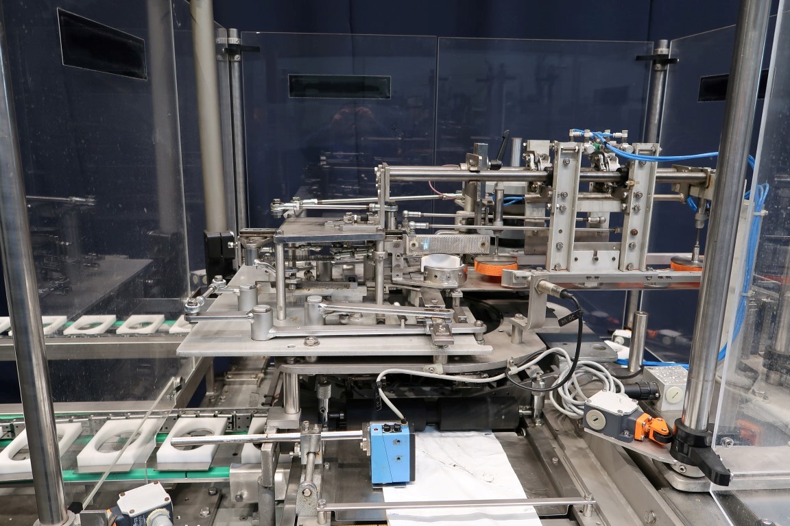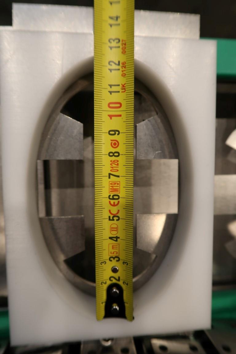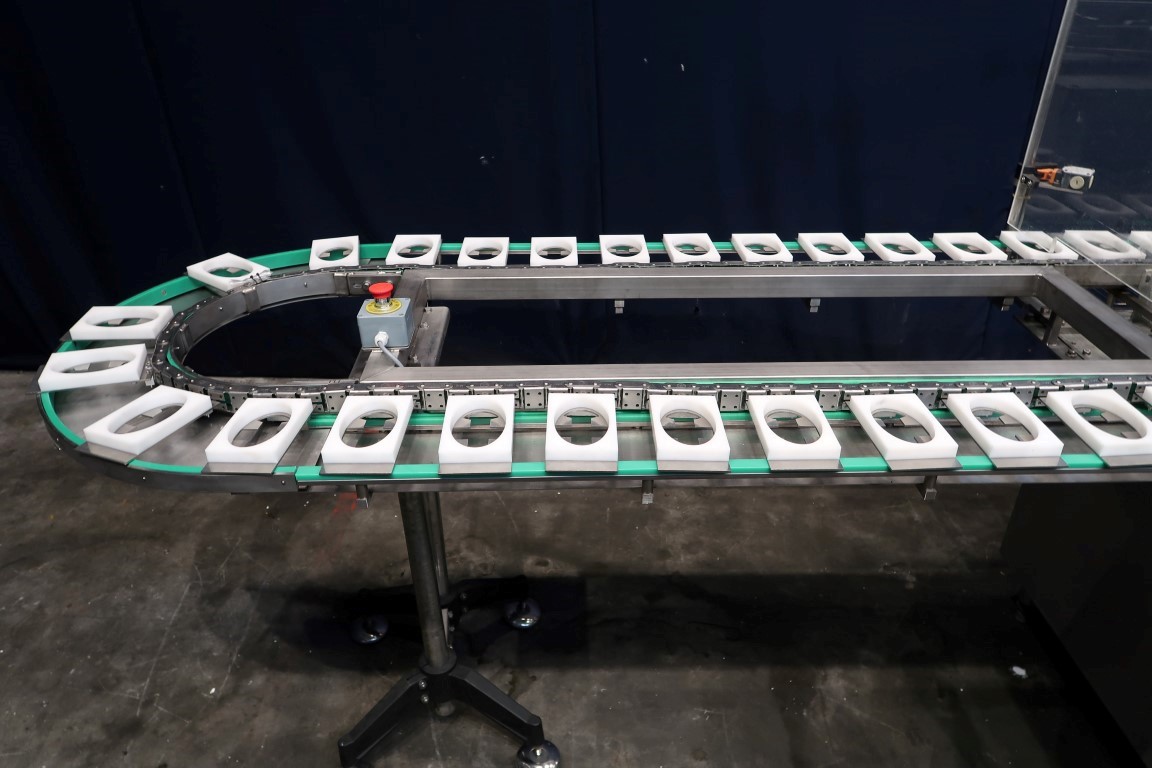 Automatic packaging machine for oval products. Performance up to 3000 pieces/h in vertical operation. Especially suitable for oval shaped products such as round cheeses and similar products. PE foil, cell glass or paper are suitable as wrapping foils. Previously used for Limburger Camembert, Romadur and Ofengold cheeses (100 and 200 gram). Control panel with Siemens S5 PLC. Motor: 380 V - 50 Hz - 3,5 kW - 20 Amp. Weight of the machine: 1.100 kg. Including electric scheme. Total dimensions: 180 x 150 x 210cm. Machine tested and running.