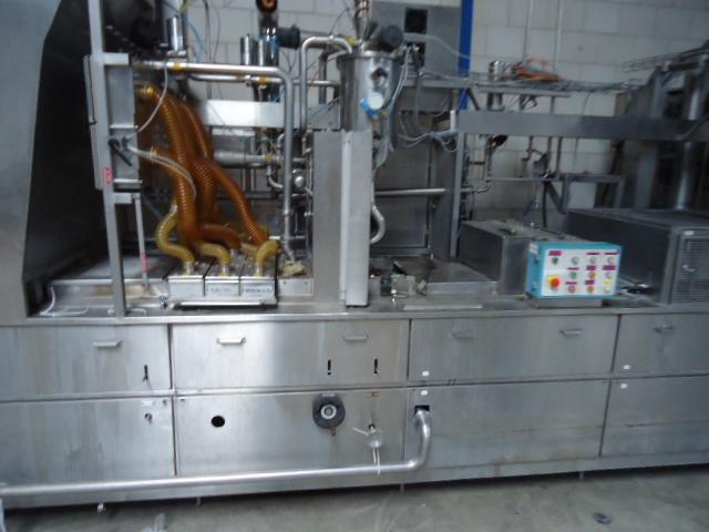 4 Lines, Cup filling and sealing machine for viscous products like yoghurt. Cup diameter 75 and 95 mm, double plates for automatic format change by moving chain 1 step forward or backward. Cup decontamination by UV light (air cooled Heraeurs cassetes) , main doser 100 - 550 ml (CIP cleanable), lid sealing and packer (only gripper 3x4, 95 mm). Control panel with Siemens S5 PLC. Dimensions filling machine only: length (without outfeed conveyors) 509 cm - width (without outfeed conveyors) 171 cm - heigth (max) 370 cm. Width +/- 8.000 kg.