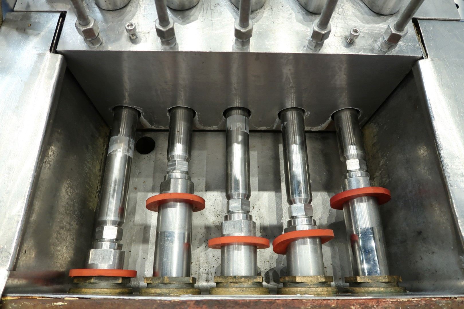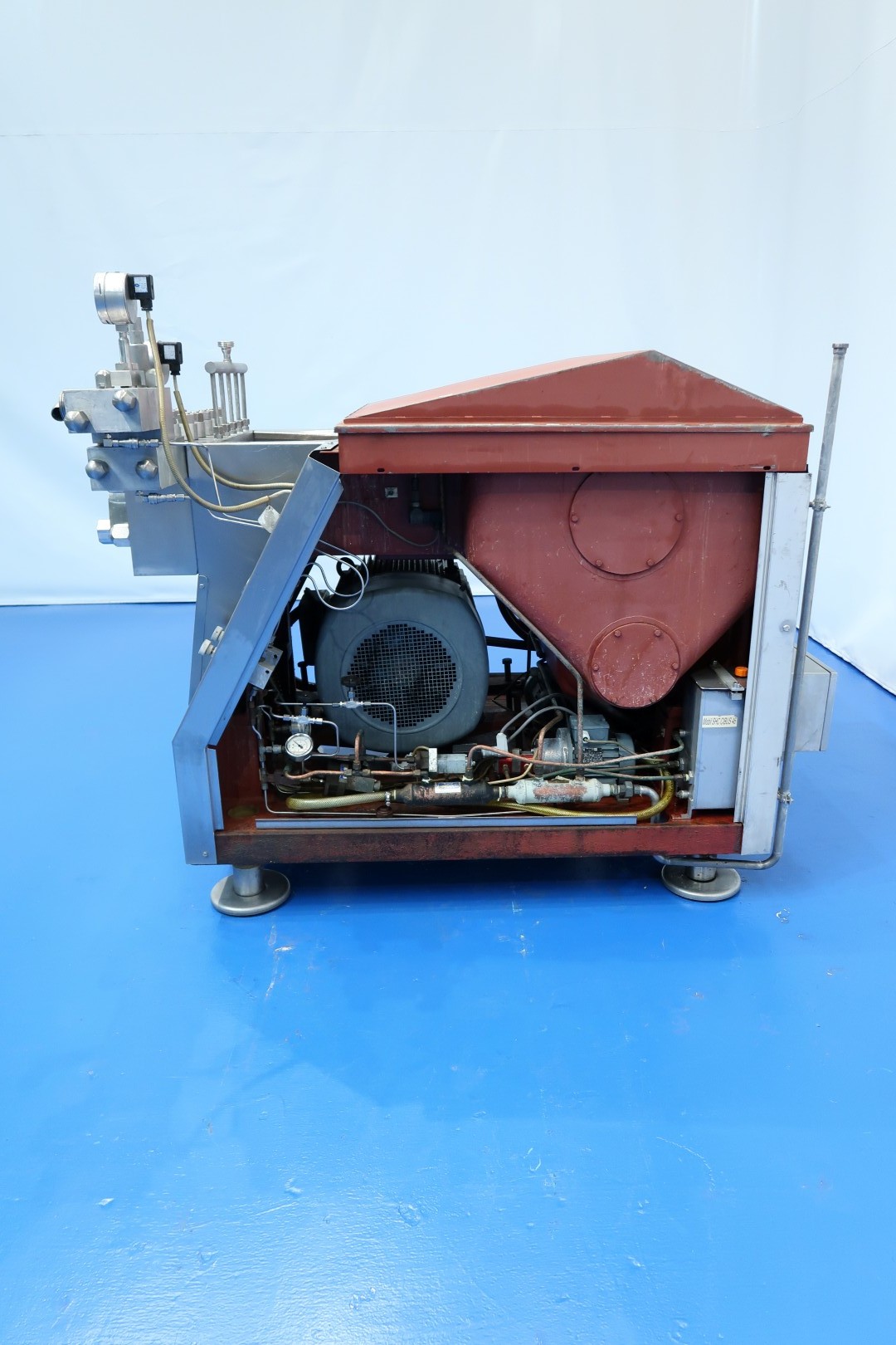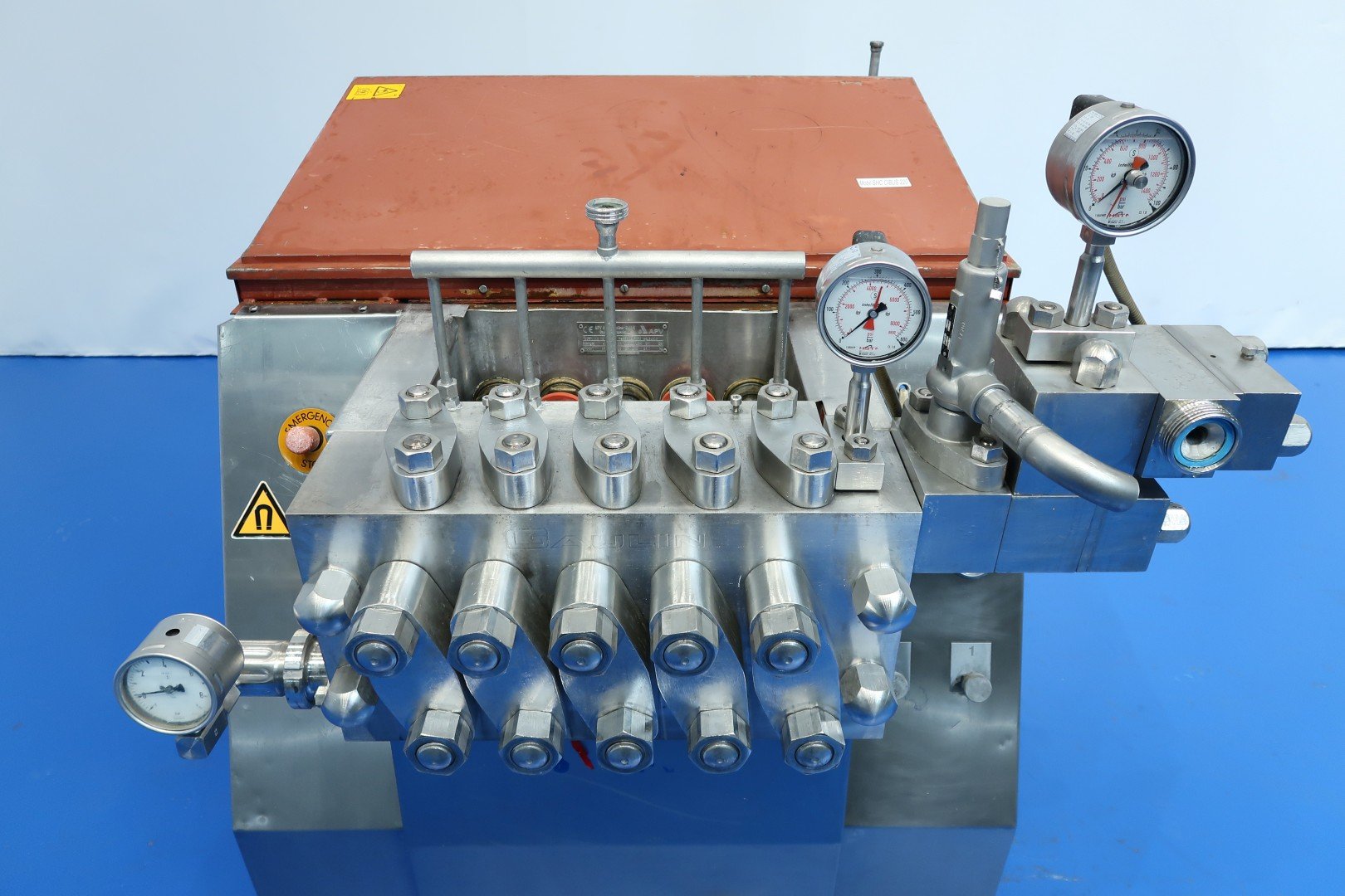 High pressure homogeniser with Ball valve for viscose products. 2 stage(s) with hydraulic pressure control. 5 Pistons, piston diameter: 38 mm (1,5") and stroke: 115 mm. Stainless steel cladded. Motor power: 55 KW and maximum pressure in current confirguration with this motor 280 bar. with frequency converter. Overpressure valve. Inlet filter. Manometer on in and outlet. Electronic pressure transmitter after 1st stage and electronic pressure transmitter with manometer after 2nd stage. Flowswitch on cooling water. Pulsation dempers with membrane on inlet and outlet. Sample crane before and after homogenizing. Connections, In/Out: 2,5" Din. Total dimensions: 190x130x147 (lxwxh) cm - weight: 2.666 kg.