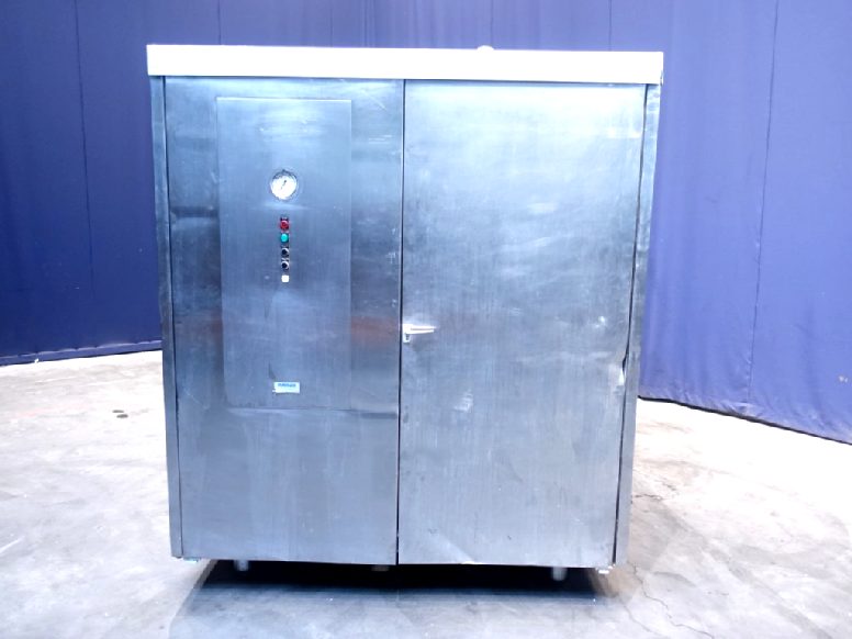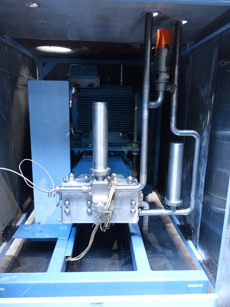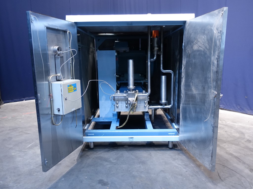 High pressure homogeniser. 1 stage with manual pressure control. 3 pistons, piston diameter: 58 mm and stroke: 79 mm. Inside sound proof box <80 dB. Connections: 2'' Clamp. Including: integrated control panel, bypass valve, manometer on inlet, flowswitch on cooling water and pulsation demper on inlet and outlet. Documentation in Englisch available.