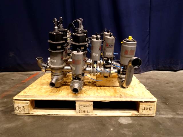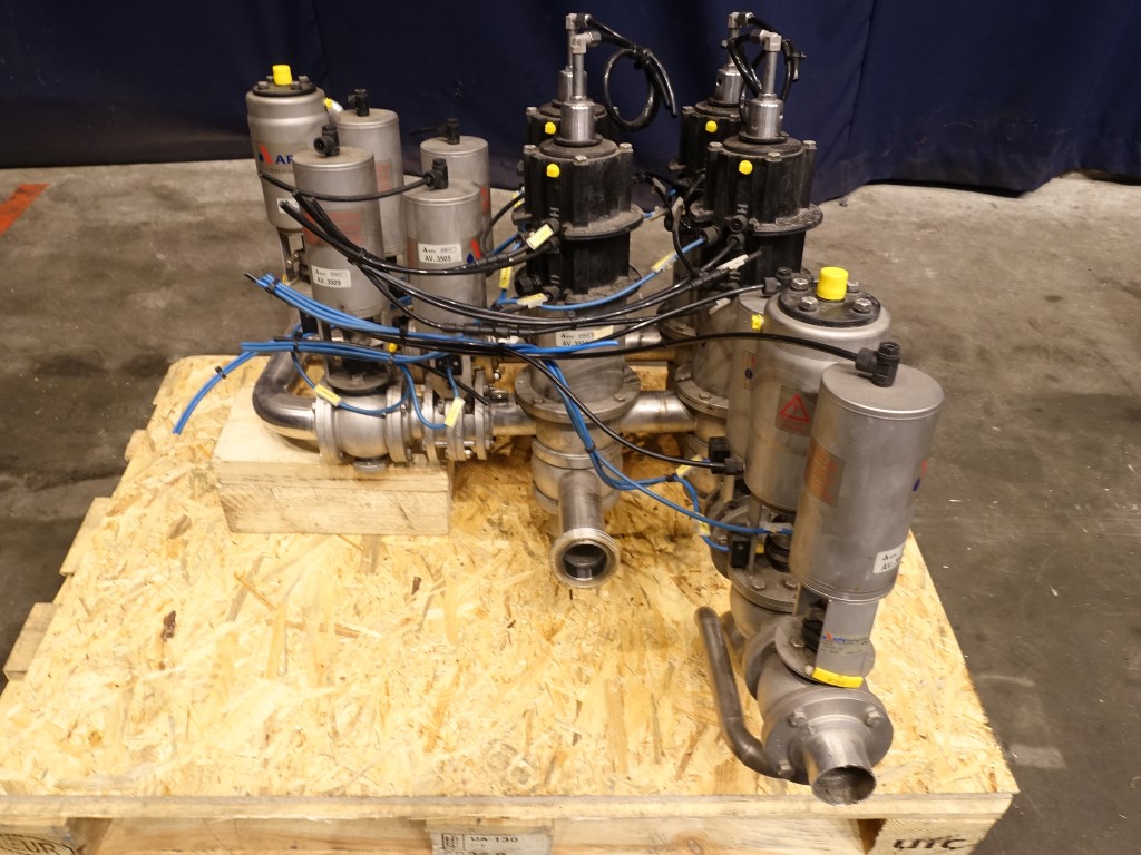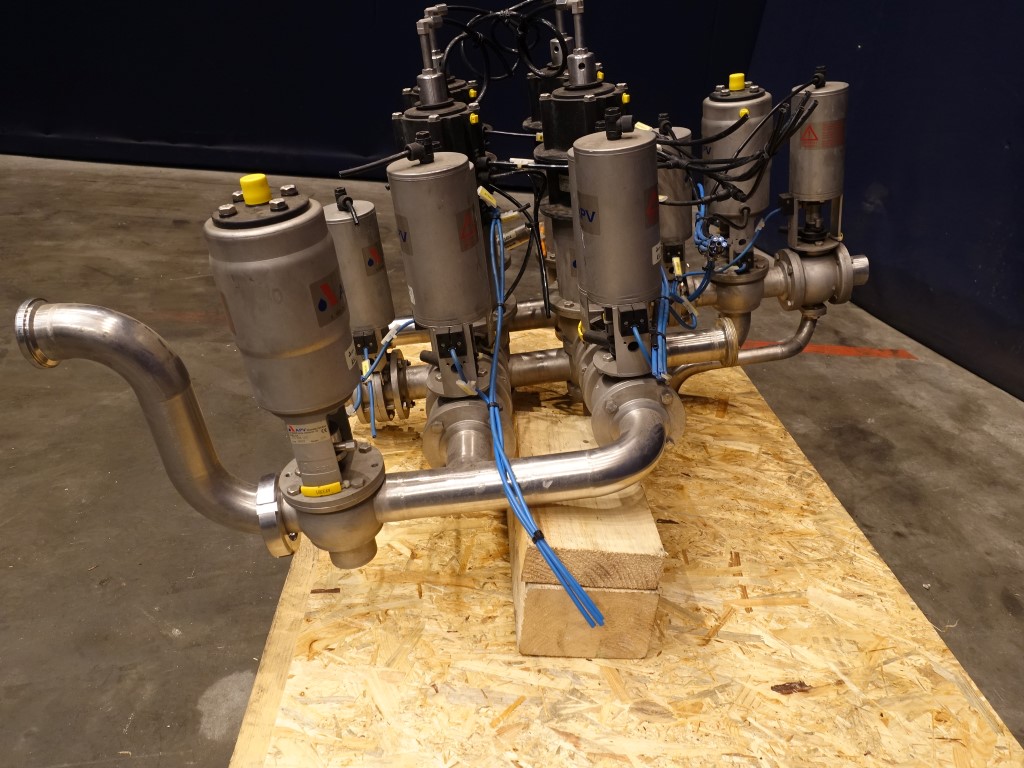 Small manifold with 4x mixproof valves, 4-way, with seal lift. 2x mixproof valves, 2-way. 3x ball valves. 4x butterfly valves. Diameter: DN50.