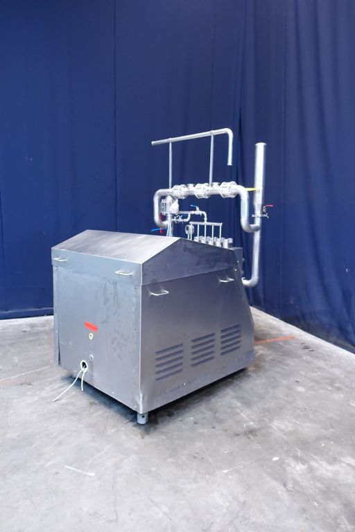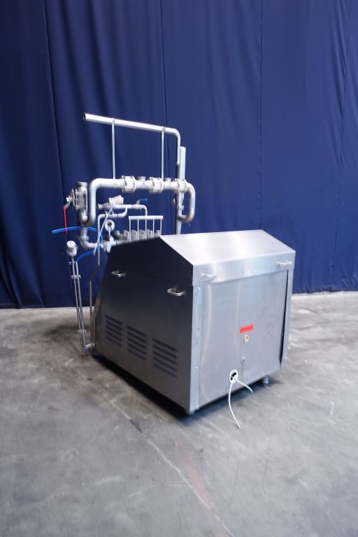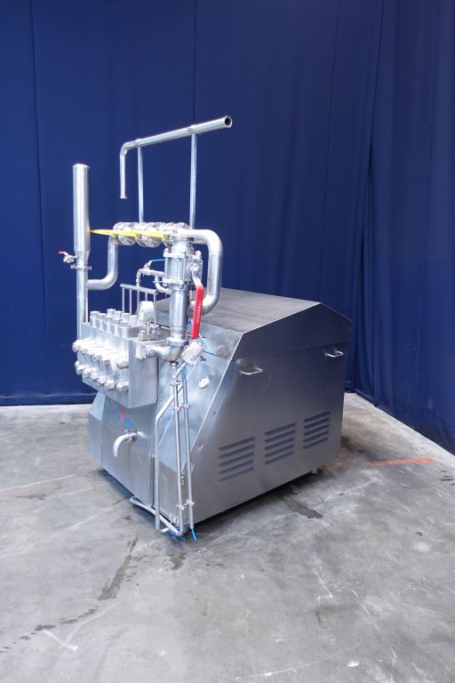 High pressure piston pump. 5 Pistons. Stainless steel cladded. Maximum pressure in current confirguration with this motor 50 bar. Overpressure valve. Bypass valve. Manometer on outlet. Pulsation demper on inlet, 4 ball valve to create 3 outlets or recirculate the product. motor :40Kw, oil cooler and oil circulation pump, weight 2,650kg, dimensions 130x160x120cm, with 3 spare pistons, Controls (start delta motor starter and freq converter for oil pump) no box.