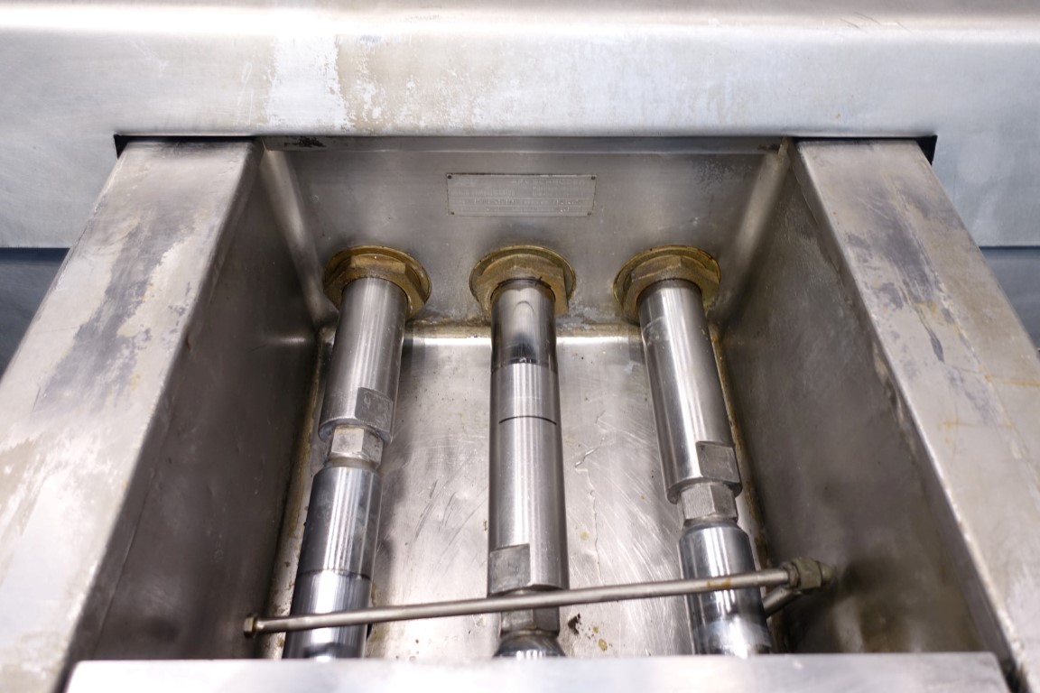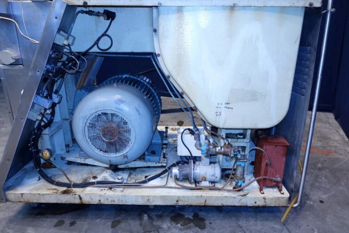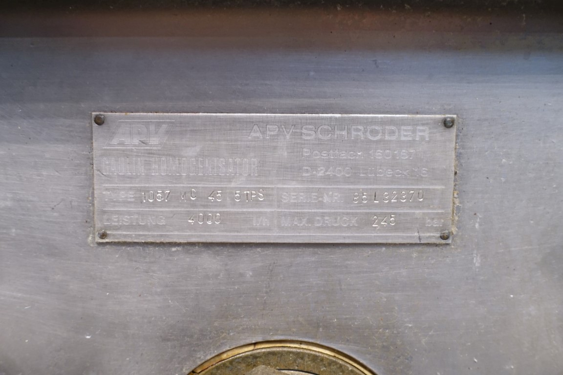 High pressure homogeniser. 2 stages with hydraulic pressure control. Poppet valves. 3 Pistons. Piston diameter: 2 1/8 '' and stroke 6 1/8 ''. Stainless steel cladded. Connections: inlet 2'' and outlet 1,5''. Current motor power: 75 kW - 980 rpm - 380 V - 50 Hz. Pressure in current configuration according typeshield 245 bar. Manometer on outlet. Excluding controls, tools, overpressure valve, bypass valve, pulsation dampers, electronic pressure transmitter. Machine can be converted with this 75 kW motor to: 10.000 ltr/h @ 245 bar or 4.000 ltr/h @ 345 bar.