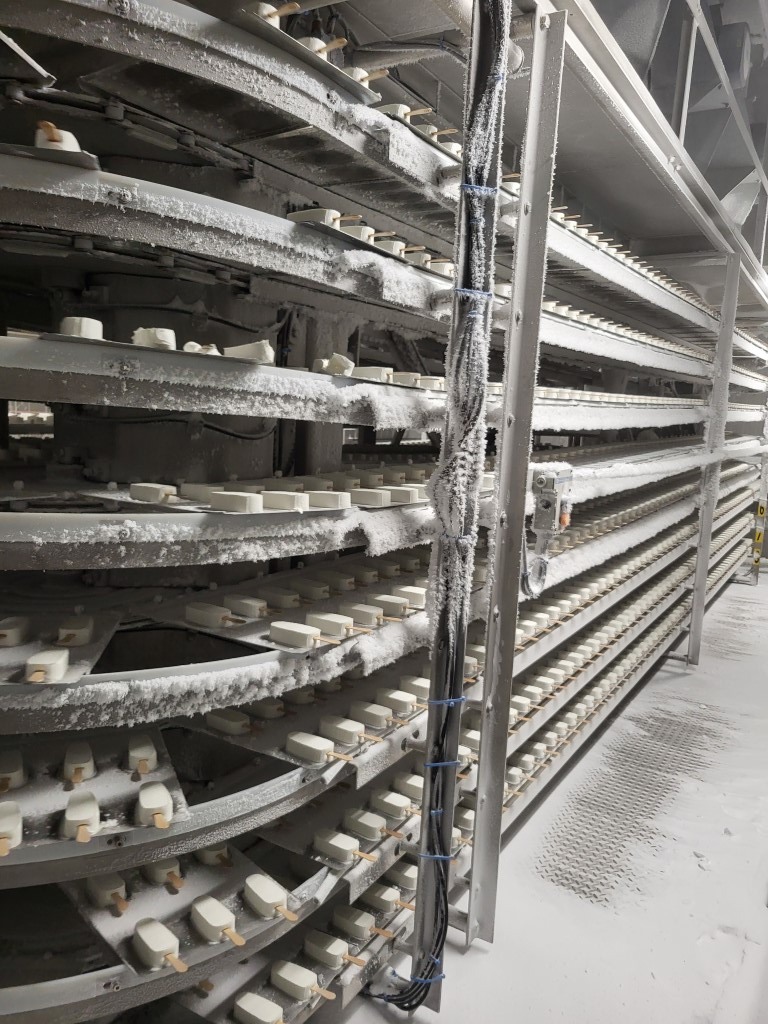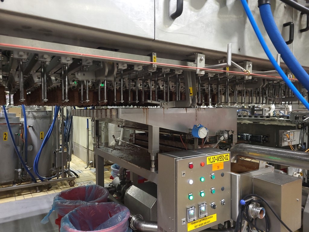 Ice cream stick “Magnum” extrusion and packaging line Line exists out of: (2-lanes extruder) for “Magnum” type ice cream with a wooden stick, product transfer device (12x2), chocolate dipping system(12-lanes) Multi dip station with 3 dips nitrogen en 2 dips fruit juice (for Solero production). You can also produce chocolate dip with a separate dip tanks APV freezing tunnel: Conveyor with plates which runs under the extruder into the freezing tunnel (and back), cooling capacity 175kW / 750 plates. Multi-lane flow wrapper (6-lanes), collection conveyor with dividers (1 by 1), conveyors with corner, empty (not successful package) foil suction device, manual preparation for packer (3,4 or 6 pieces) with 3 format sets. Cama cartoniser 2016 including Nordson ProBlu 7 hot glue device. Current workable speed of the complete line, 14.000 packed ice creams per hour, due to manual loading of the box. Line can produce up to 18.000 pieces per hour). Excluded in the offer: Continuous Ice Cream Freezer, check weigher, metal detector and shrink foil machine."