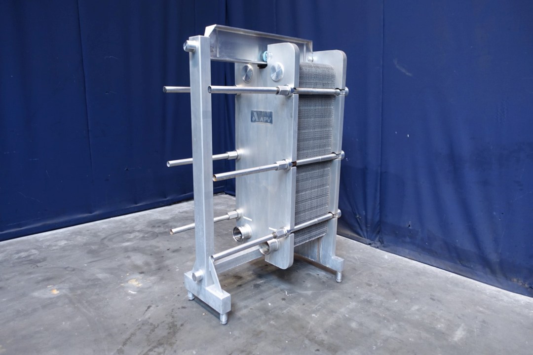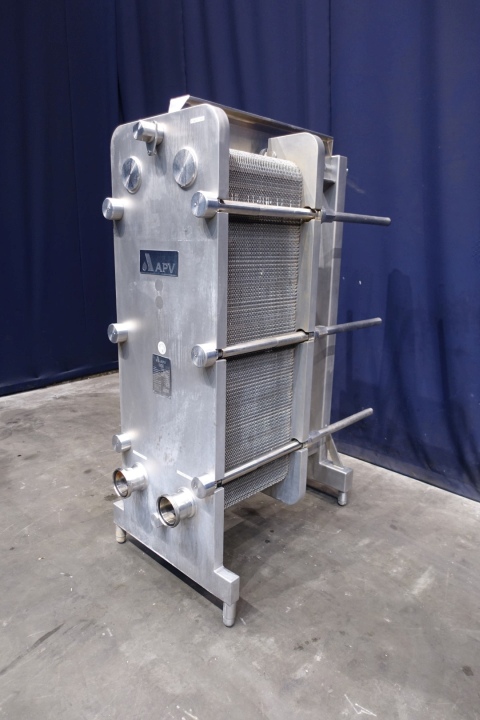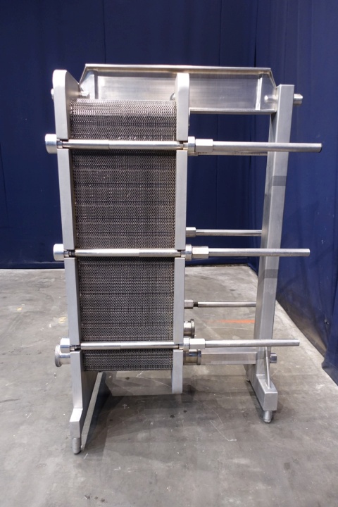 Plate heat exchanger, sanitary (PHE). Pressure: 10 bar, Beam length: 147,5 cm, connections: 4x4" DIN. Currenct configuration: 1 Section: 105 plates - Connections head: 2 down, follower 2 down. Dimensions: 130x80x193 (lxwxh) cm, weight: 1.355 kg's.