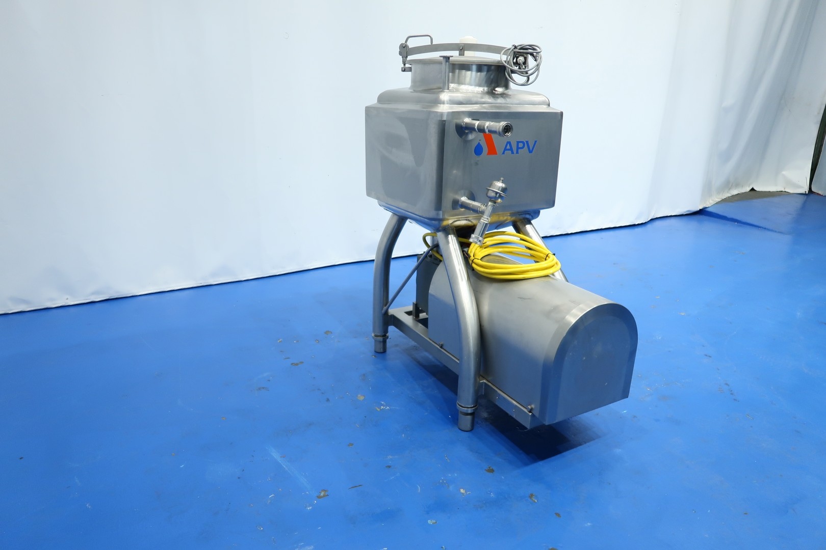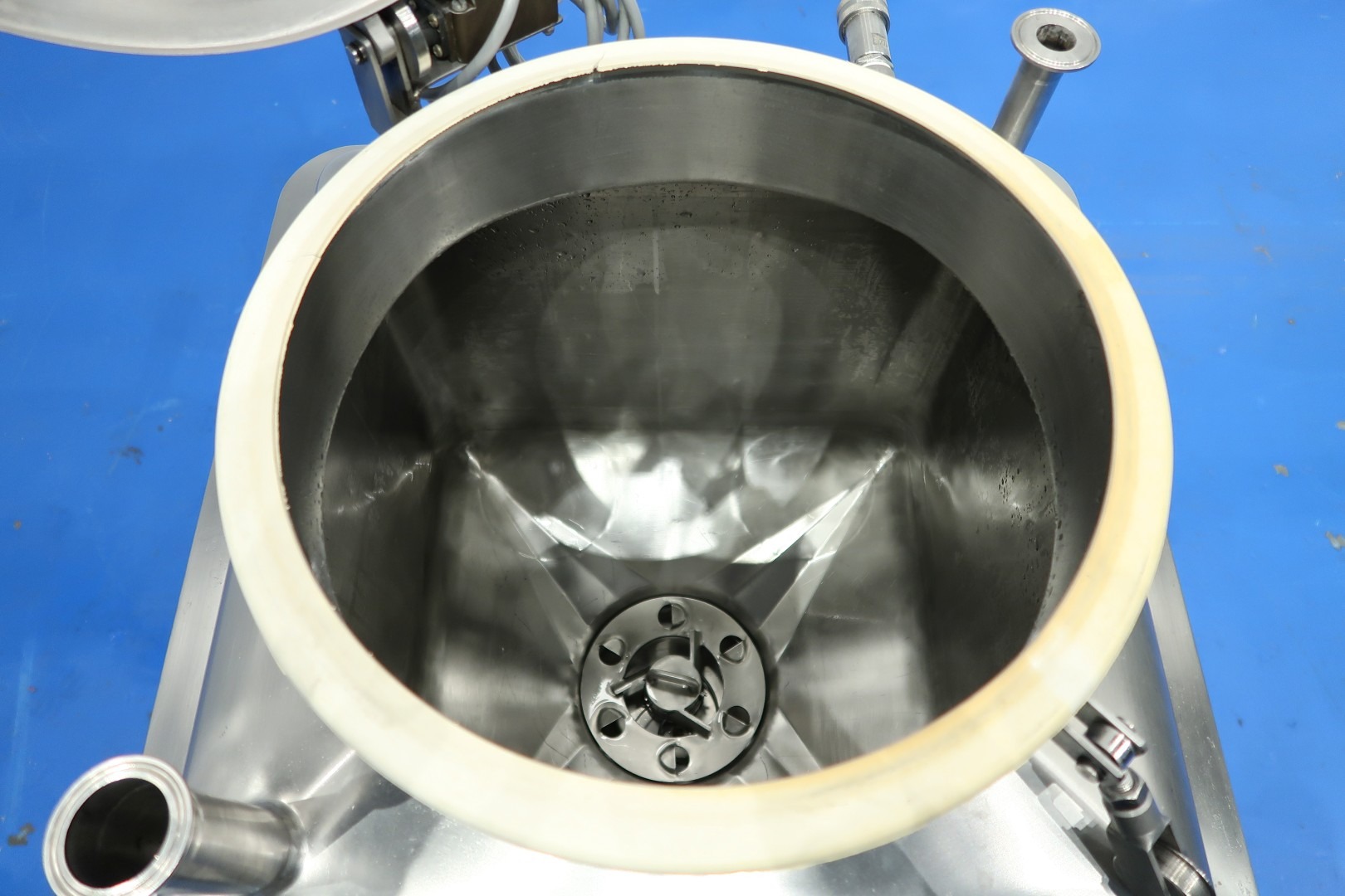 Liquiverter on SS frame with 4 x adjustable feet. Tank volume: 150 liter, double jacketed, 1x 1,5" Tryclamp connection (liquid ingrediënts inlet) for product. 1x 1" Tryclamp connection for Cip-spray bowl. Outlet connection 1 x DN40 Din. Jacket with 2x quick connect coupling, Manhole in top round Ø 40 cm with safety sensor - breather in lid. Motor: 7,5 kW - 15,3 A - 1.450 rpm, impellor size: 210 mm diameter. Inner dimensions: 55x55x55 cm. Outletheight 57 cm. Testmovie available. Total dimensions: 135x65x145 (lxwxh) cm - weight: 216 kg.