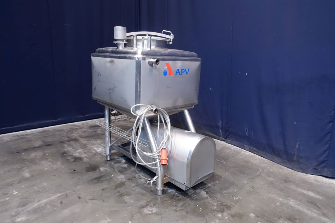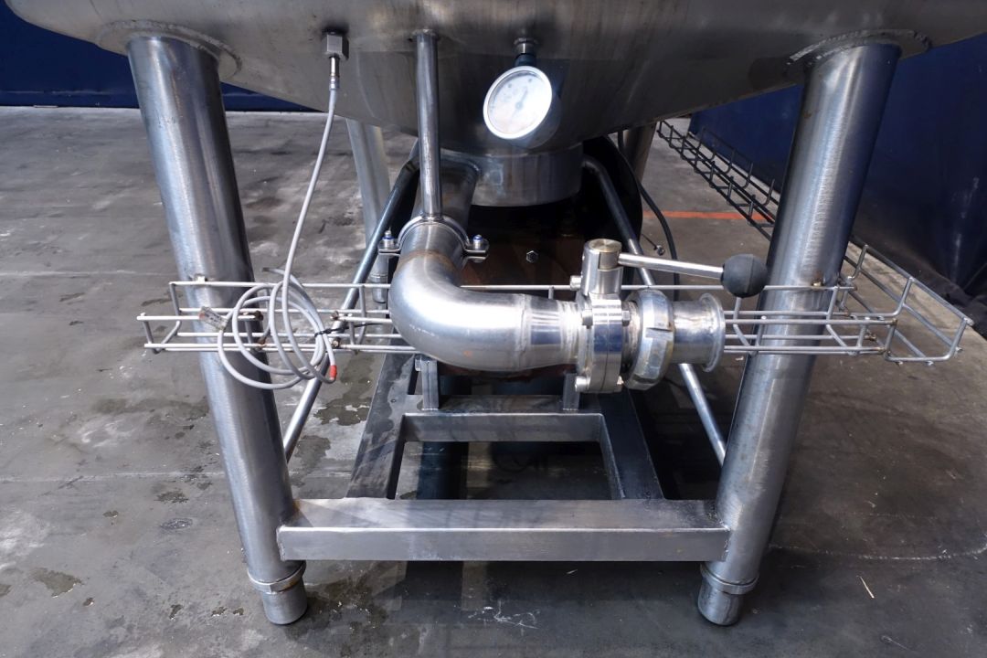 Liquiverter. Tank volume: 500 ltr. Double jacketed (slight explosion damage on jacket only not to inner tank). Spray bowl for CIP. Temperature indicator and manometer. Liquid ingrediënts inlet. Breather. Motor: 11 kW - 1.460 rpm. Total dimensions: 160 x 100 x 170 cm.