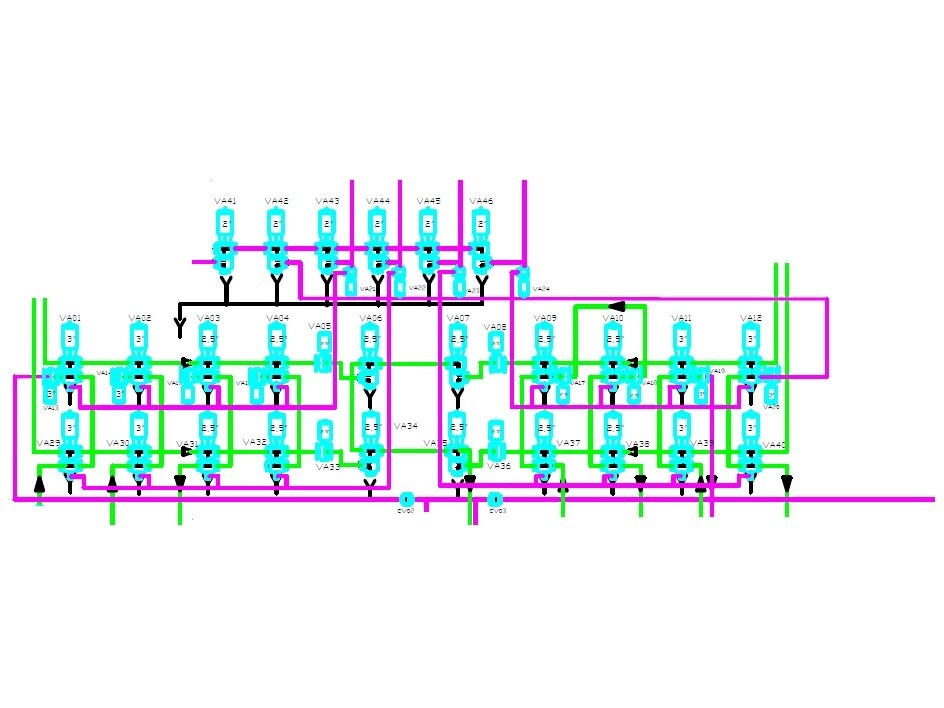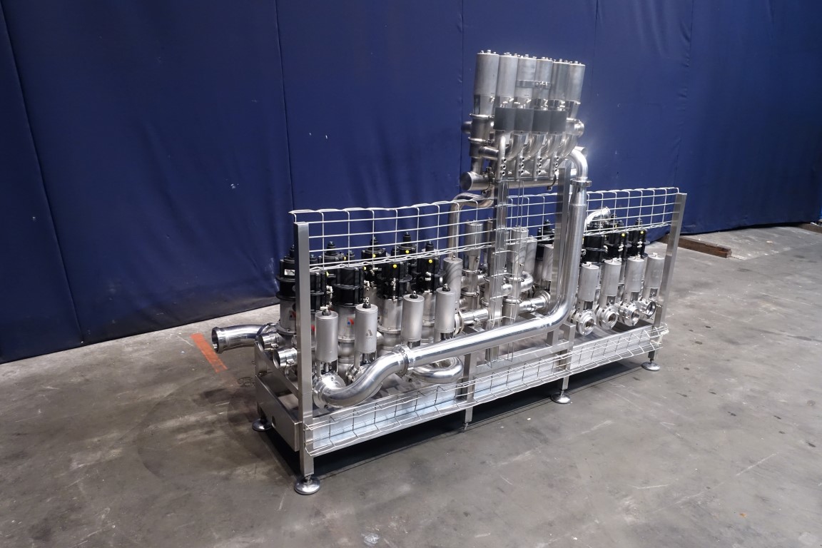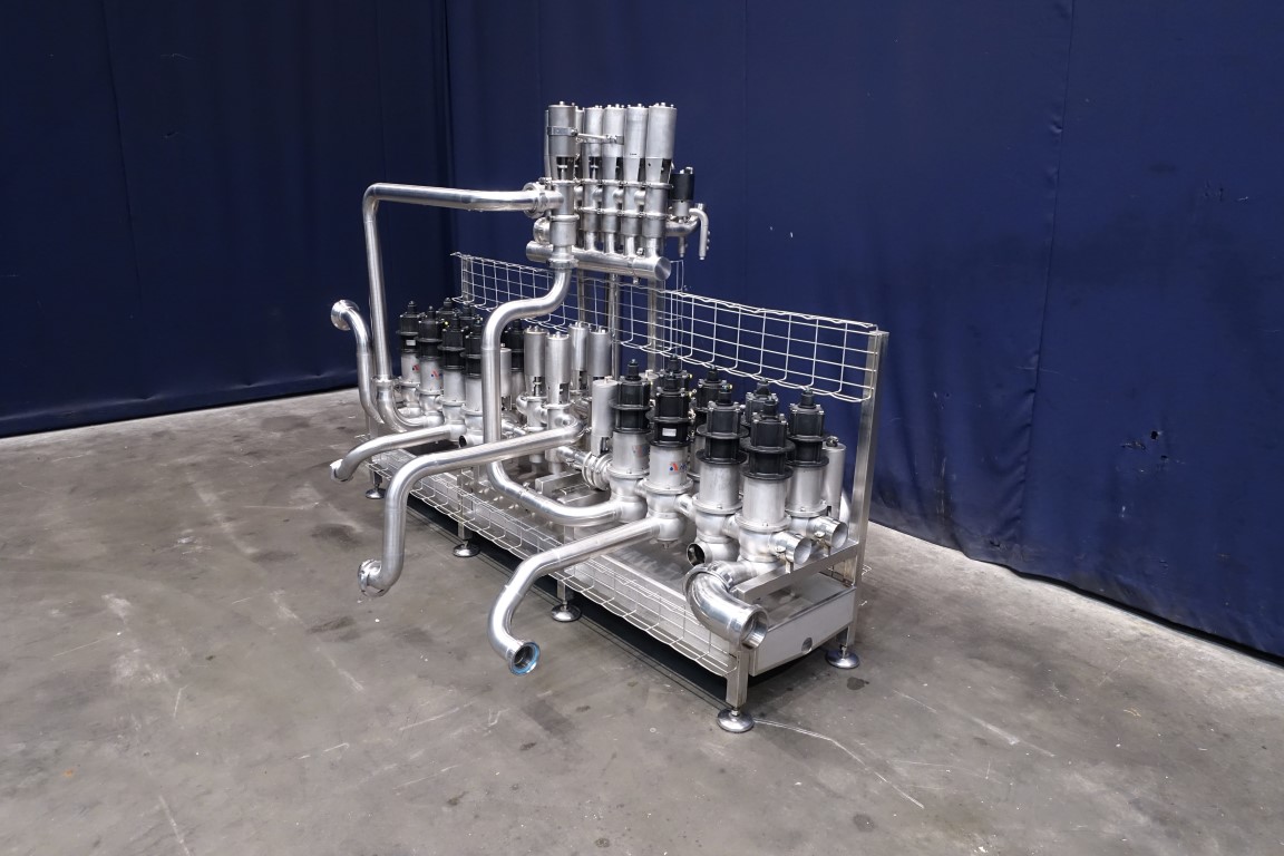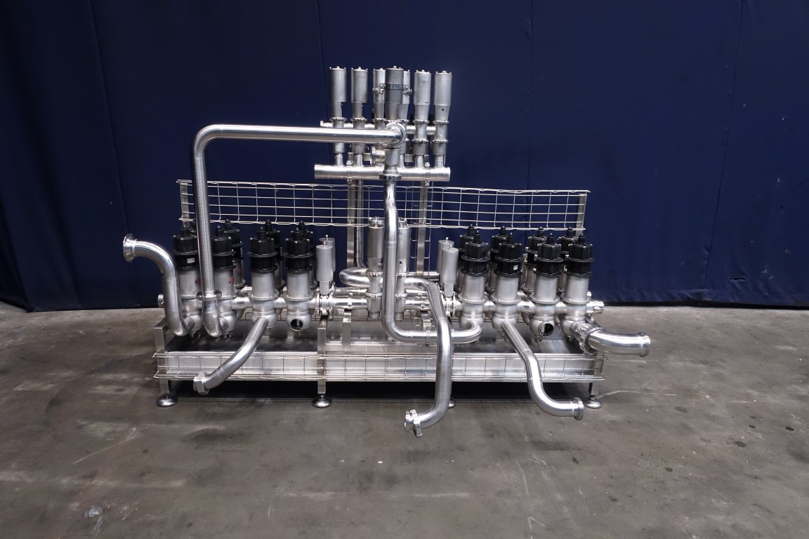Valve manifold with the following components: 2x E&H pressure sensor - 1x Klay-instrument pressure sensor - 2x Samson sanitory 2-way regulating valve - 2x Manual 2-way butterfly valve - 2x Nocado Pneumatic 2-way butterfly valve - 1x Alfa Laval 3-way valve - 1x Alfa Laval 2-way mixproof valve. Following valves 4": 6x Alfa Laval 2-way valve - 2x Alfa Laval 2-way mixproof valve - 1x Alfa Laval 3-way valve - 2x Alfa Laval 4-way valve and 2x Alfa Laval 4-way mixproof valve.