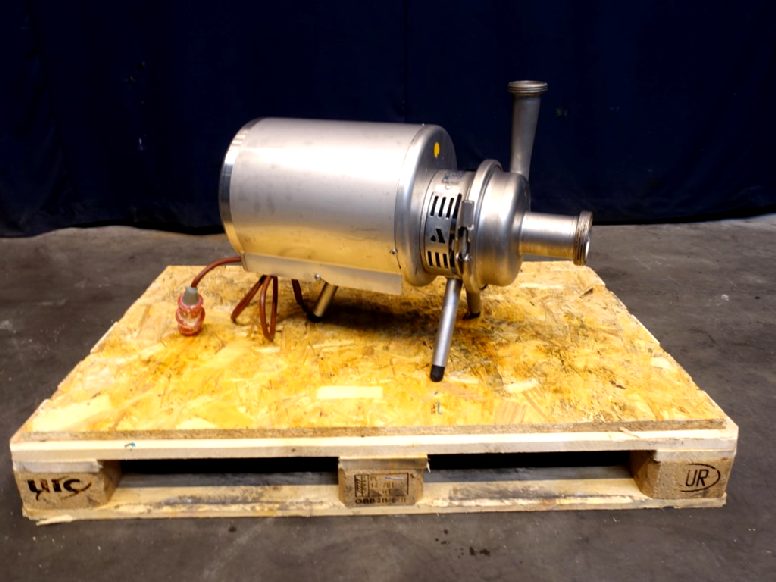 Sanitary inducer centrifugal pump. The inducer boosts the inlet pressure, and the risk of cavitation is correspondingly reduced. Current motor: 4.0 kW - 7,5 A - 2875 rpm. Impellor diameter: 175 mm. Connections: DN65 / DN50, SMS.