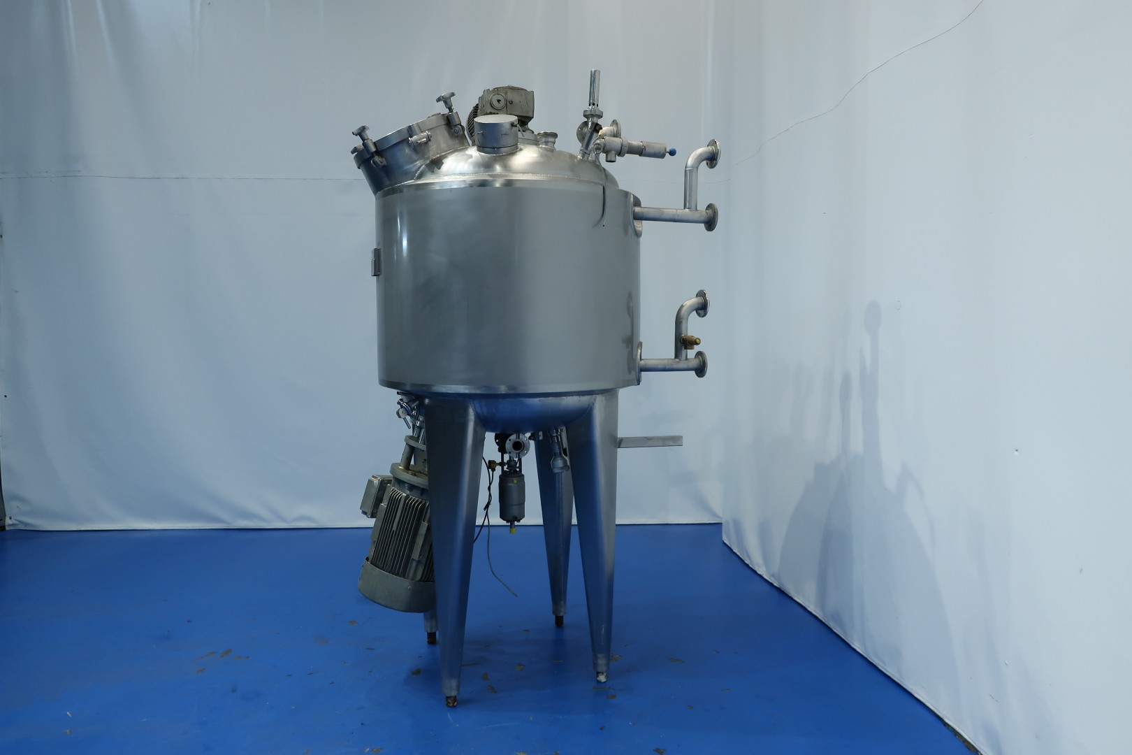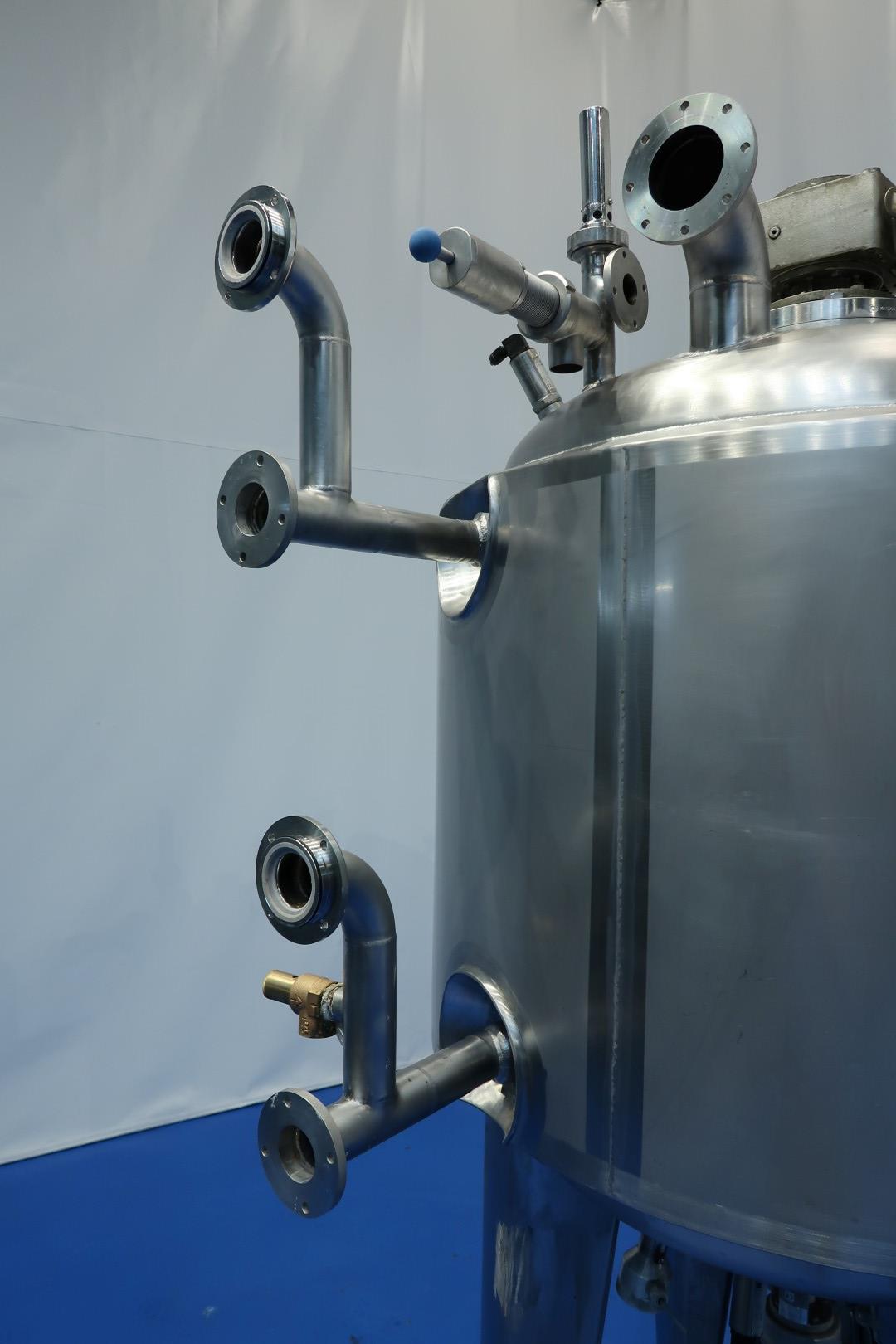 Vacuum process tank with double jacket for heating and cooling, 2 agitators. A heavy duty high speed Rotor/stator - screen - propellor mix agitator with motor power: 18,5 kW! speed: 2.920 rpm. + Scraper Agitator in cylinder part, Motor power: 0,86 kW, max 32 rpm. Pressure in jacket: 4 bar. Pressure in tank: vacuum -0,8 / +0,99bar over pressure. with over and under pressure protection valve mounted on top of the tank. Product outlet bottom valve 1,5" valve (make APV) with position sensor, outlet height: 93,5 cm. Including sample valve and light. Sensors in bottom Pressure sensor (PT), Temperature sensor (TT) and level sensor (LT), High level sensor in top HL. 2 Connections on top for CIP spray bowls in top (currently not inserted). Manhole, round, diameter 272mm. 3 Adjustable feet. Inside dimensions of tank: Ø 88,5 cm and cilindrical height 85 cm. Connections topside tank: 3x 2,5" Din and 1x DN80 - connections side of tank: 4x 2,5" - connections bottom: 2x 2" Din. Total dimensions: 140x95x240 (lxwxh) cm - weight: 620 kg.