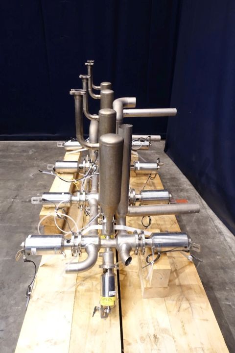 Set of aseptic valves (valve cluster). Connections DN65, 4 lines are connected in aseptic way to a pipeline to connect 4 lines to 1 line 8x DN80 aseptomag valves. 4 x 2 valves for steam in and condensate out to create a steam lock, the asptomag valves also have a chamber to be able to flush peroxide, 4 condensate collecting tanks (if valve closed) on steam inlet pipe. Total dimensions 180 x 110 x 135 cm.