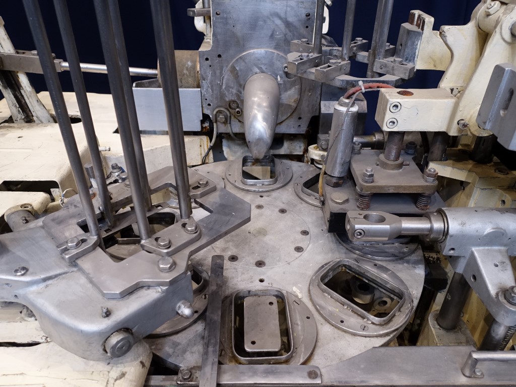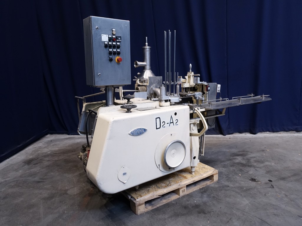 Rotatry filler, with 1 Head for viscose products like margarine, with direct link filling. Cup size rectangular: 75 x 115 mm Stations: Cup destacking, no- cup detection, Maindoser (50-500ml). Seal dispending by vacuum, heat sealing, snap-on lid (station incomplete), outfeed on +/- 1,5 meter single lane outfeed conveyor. Complete with control panel. Total dimensions: 290 x 160 x 190 cm.