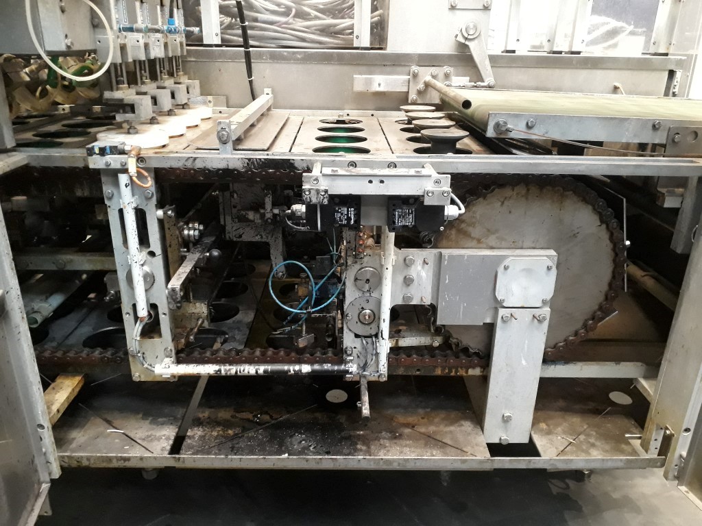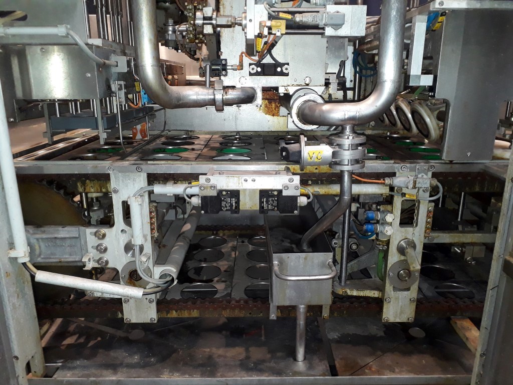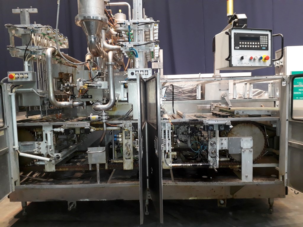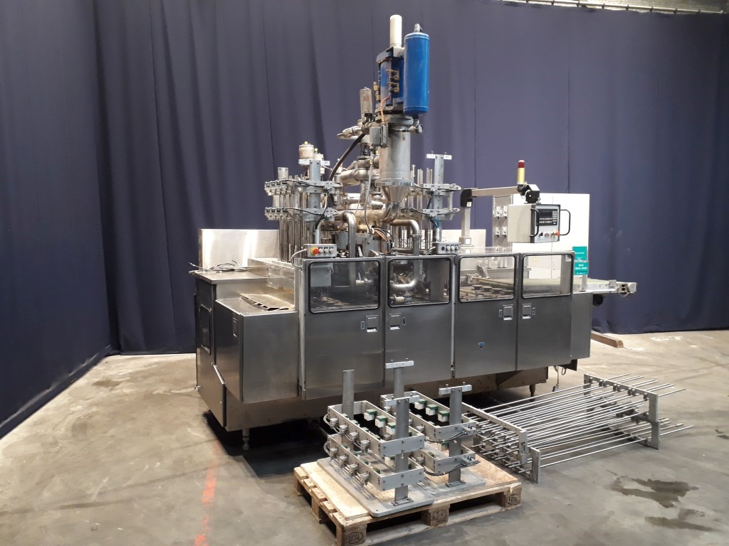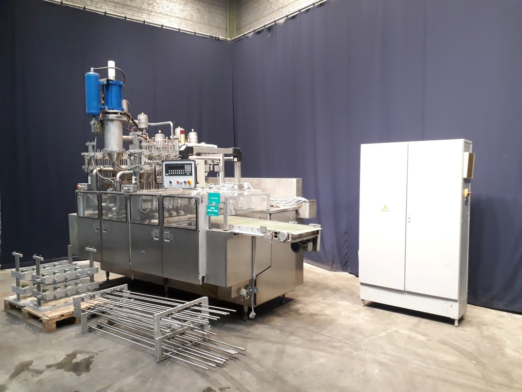 Cup filling machine, 4-lanes, for round cups of diameter 127 mm. Diameter of the snap cap cover 132 mm. Cup destacking, cup control, filling (piston doser, 250 (± 2) gram and 500 (±0,65) gram, CIP cleanable, compensator, heated cutting wire), snap cap cover station, outfeed conveyor. Including control panel with Siemens S5 PLC controls. Weight of the machine ± 4600 kg.