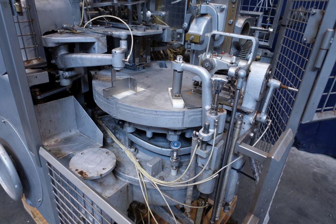 Fully automatic filling and wrapping machine for butter in aluminum foil or parchment paper. Product feed by direct link up. Photo cell for print centring device (paper correction by spot mark). Central greasing system. Excluding compensator, liniair potention meter to control a feed pump, date coder or outfeed conveyor. Format set on this machine: stick pack, 125 gram, ± 125 x 35 x 32 mm. Control panel with PLC control. Total dimensions: 210 x 145 x 230 cm.