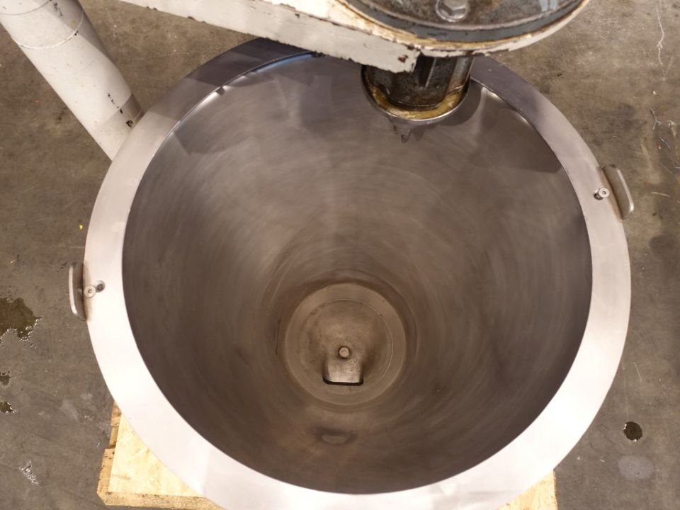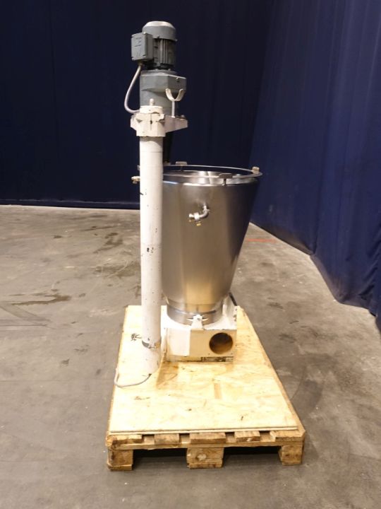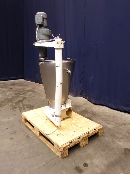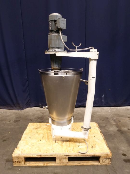 Hopper with agitator, previously used for Benhil 8205 model. Top driven agitator, 0,15 kW - 0,65 A - n1: 1380 rpm - n2: 20 rpm. Agitator itself is missing (drivework available). Open top with cover. Conical. Product outlet to head of Benhil 8205. Double jacketed. Inside dimensions of hopper diameter: 50 cm, height 70 cm. Total dimensions: 70 x 80 x 160 cm. used on processed cheese.