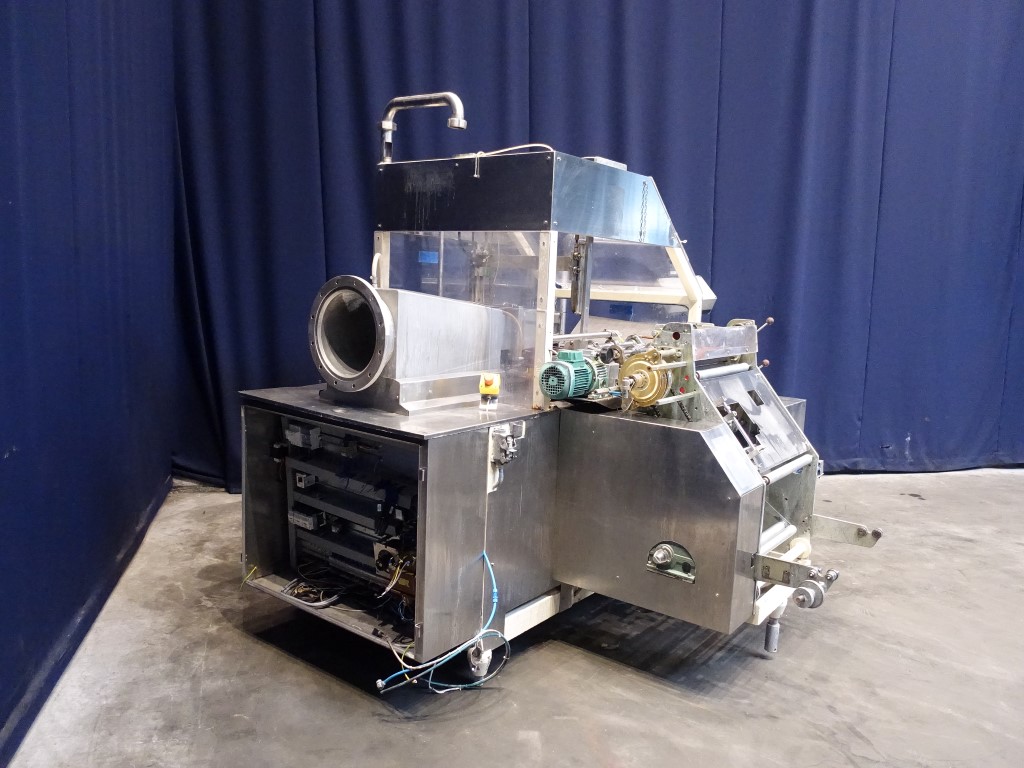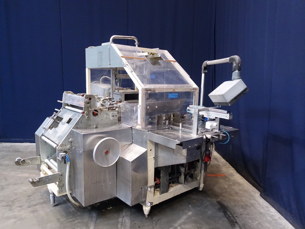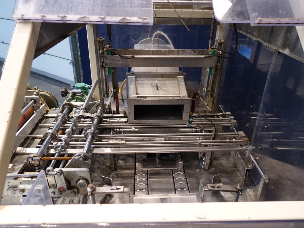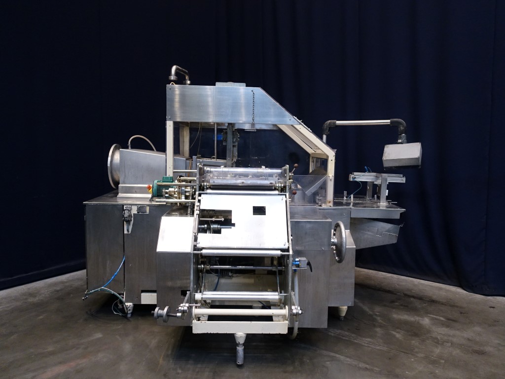 Fully automatic block forming and wrapping machine for margarine blocks in aluminum foil or parchment paper. Product feed by direct link (double jacketed). Outfeed conveyor of ± 50 cm. Format set: 2/2.5kg kg, ± 285 x 100 x 95 mm. Controls are incomplete. Excluding dosing unit and resting tubes. No documentation. Total dimensions: 290 x 220 x 230 cm.