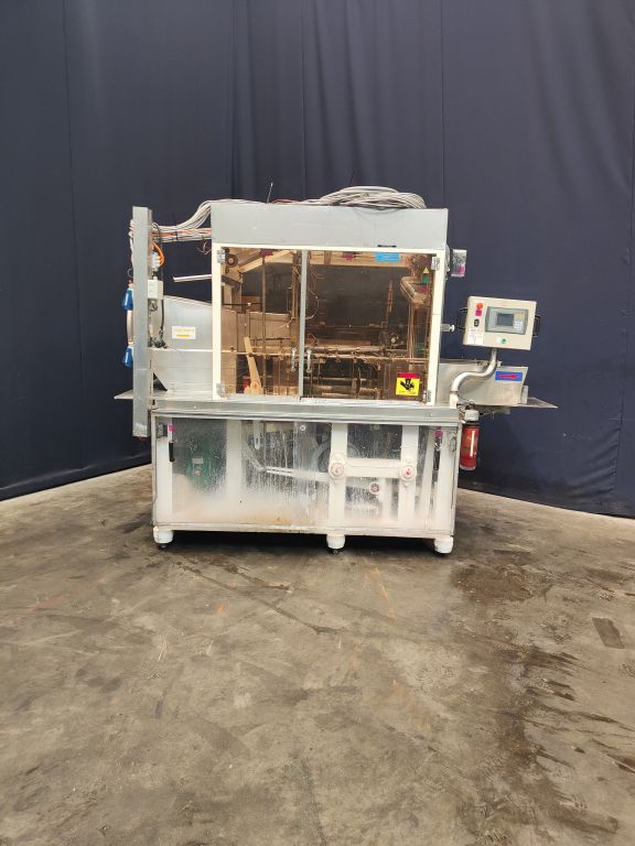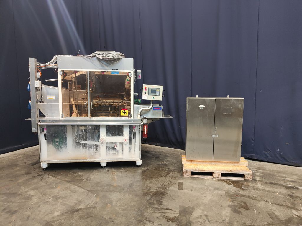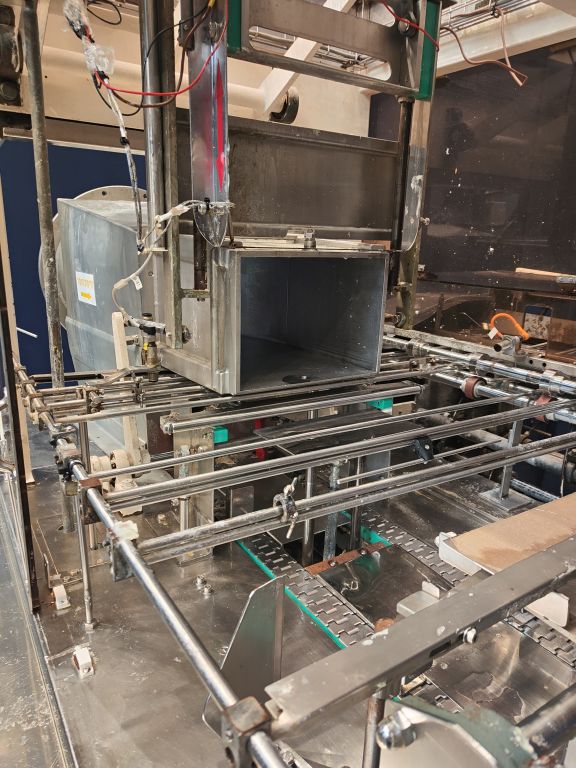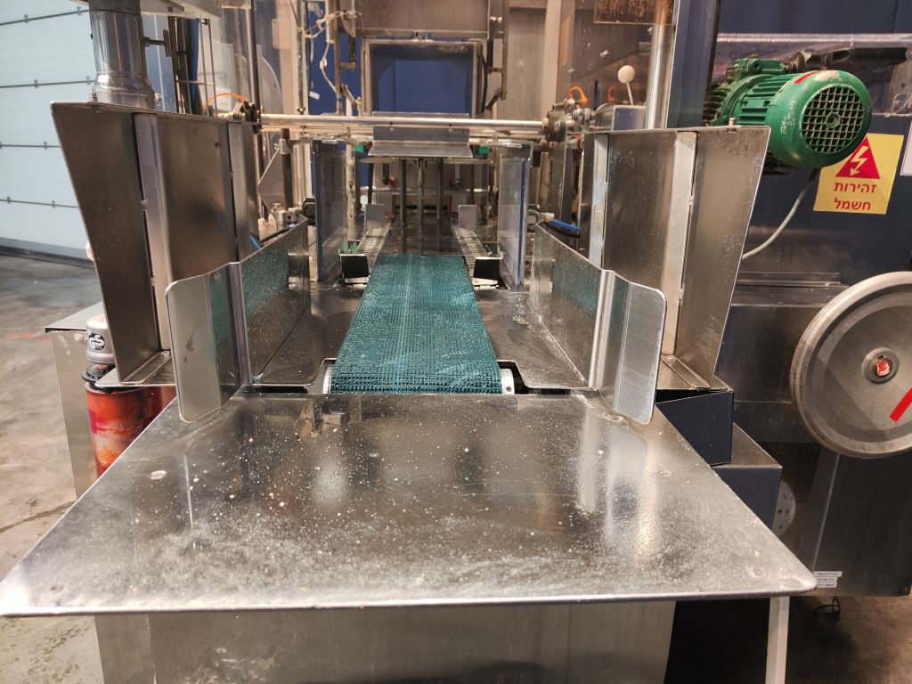 Fully automatic filling and wrapping machine for margarine in aluminum foil. Product feed by direct link. No date coder. Photo cell for print centring device (paper correction by spot mark). Outfeed conveyor of 75 cm. Format sets on this machine: 10 kg, 300 x 220 x 180 cm. Capacity: +/- 180 blocks per hour, depending on format and product. Control panel with relay control. Excluding dosing unit and resting tubes. Total dimensions: 290 x 220 x 220 cm.