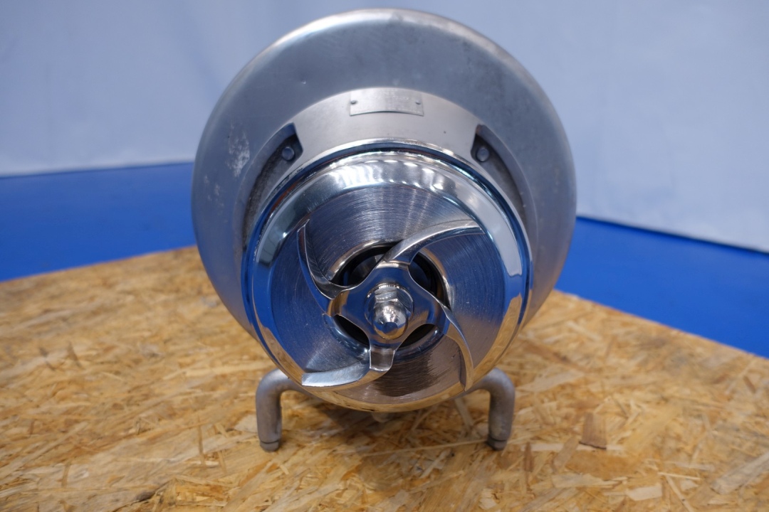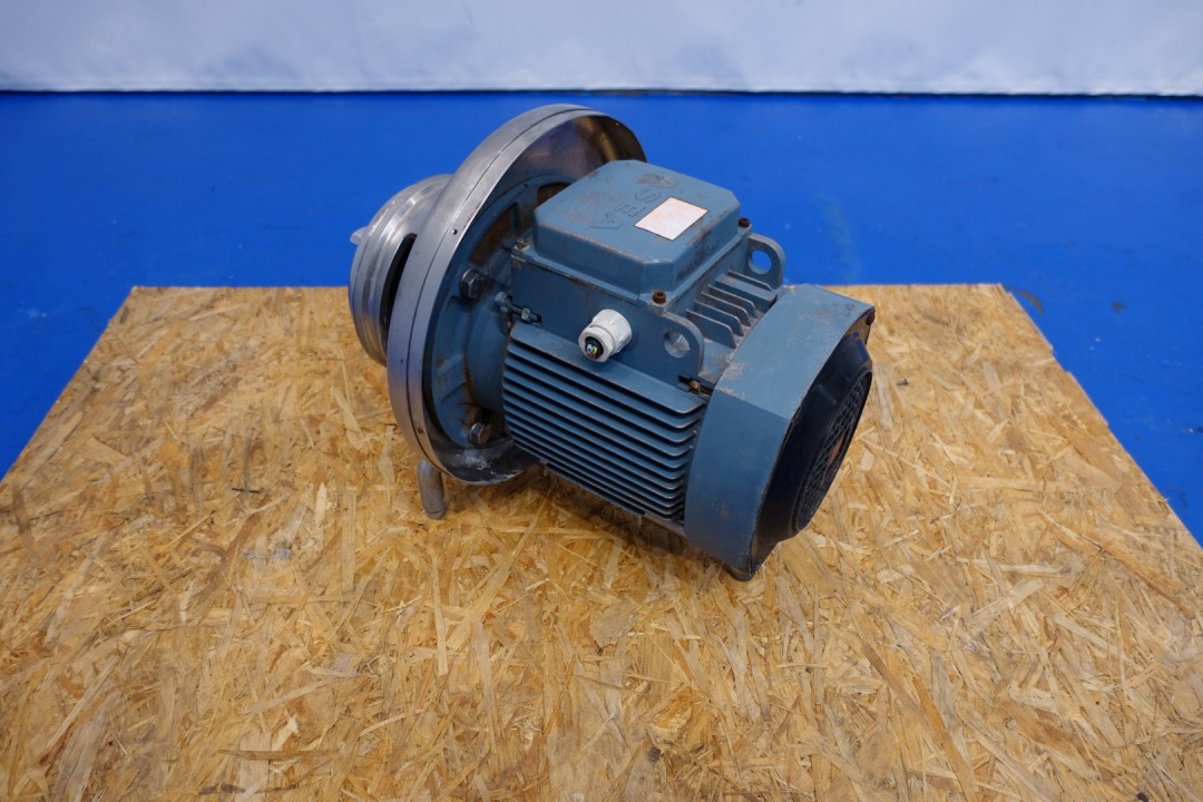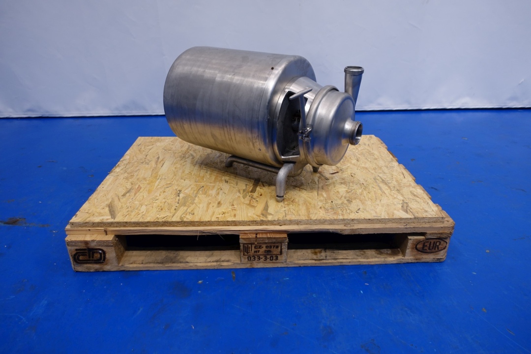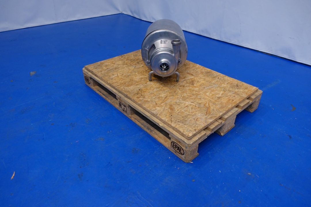 Sanitary centrifugal pump. Current motor: 3 kW - 6,3 A - 2.850 rpm - 50 Hz Impellor diameter: 140 mm. Connections: (in) 2,5'' / (out) 2" SMS. Dimensions: 58x34x36 (lxwxh) cm - weight: 80 kg. Capacity estimated