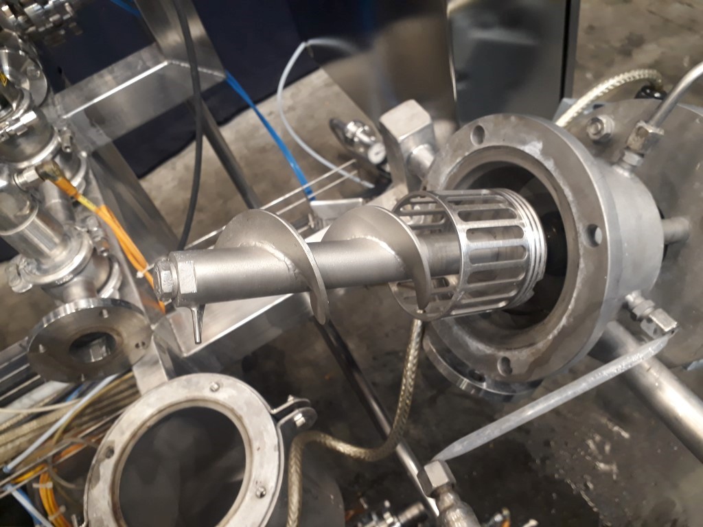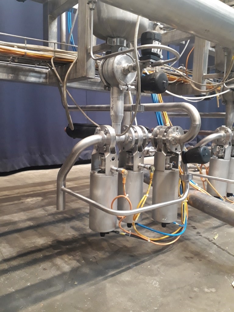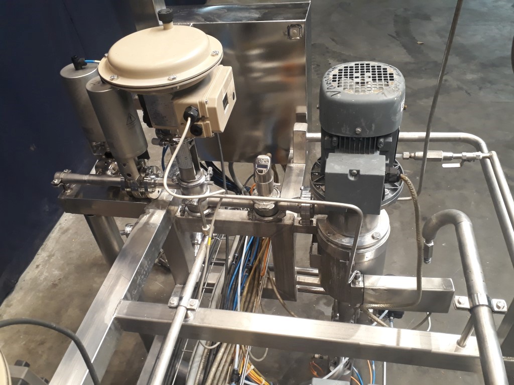 Inline mini fruit mix and foaming machine, Aseptic design. Head dimensions: inner diameter 100 mm and length: 150 mm. Volume: 4 ltr. Single jacketed. Main motor 0,75 kW - 1,93 A - 1418 rpm. Max temp. 100°C. Max pressure 6 bar. Connections for insert of sterile air / nitrogen, flow transmitter for air, pressure transmitter (IFM) on outlet and counter pressure valve (Samson). 4 pieces mounted on 1 frame (STN13482 + STN13483 + STN13484 + STN13485) , can be used as small foaming machine or as a set for a 4 line machine to feed 4 different products. Total dimensions 4p 130 x 310 x 230 cm.