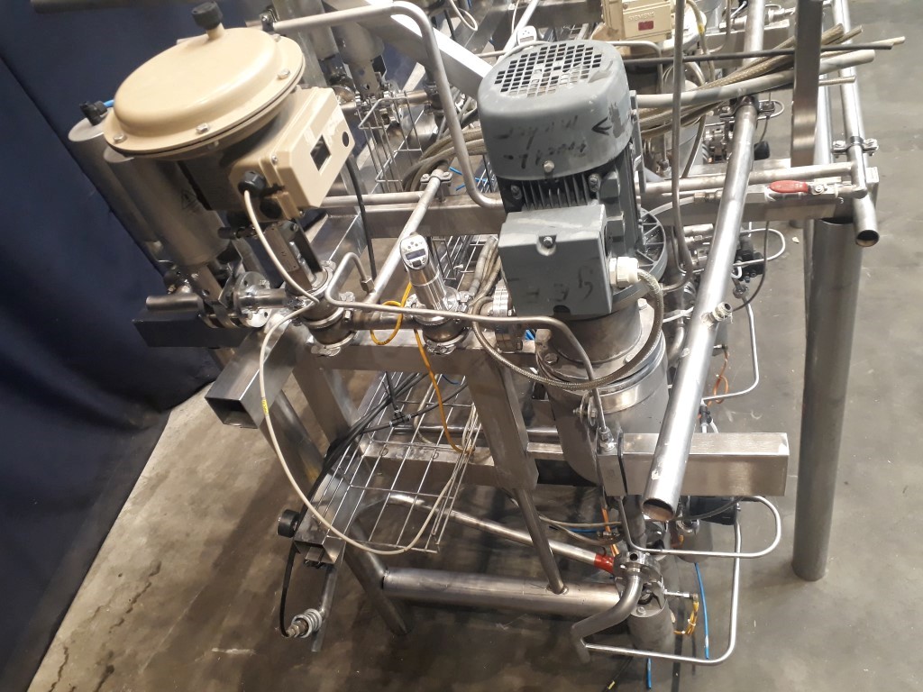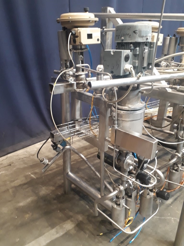 Inline mini fruit mix and foaming machine, Aseptic design. Head dimensions: inner diameter 100 mm and length: 150 mm. Volume: 4 ltr. Single jacketed. Main motor 0,75 kW - 1,93 A - 1418 rpm. Max temp. 100°C. Max pressure 6 bar. Connections for insert of sterile air / nitrogen, flow transmitter for air, pressure transmitter (IFM) on outlet and counter pressure valve (Samson). 4 pieces mounted on 1 frame (STN13482 + STN13483 + STN13484 + STN13485) , can be used as small foaming machine or as a set for a 4 line machine to feed 4 different products. Total dimensions 4p 130 x 310 x 230 cm.