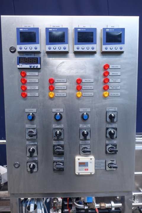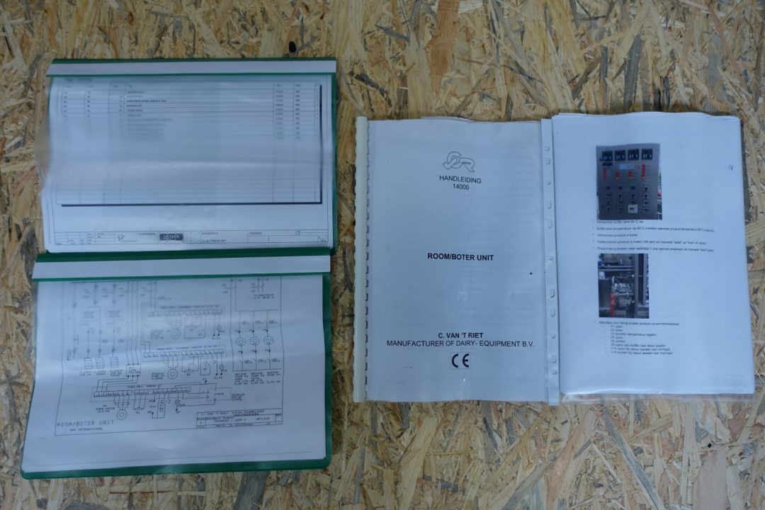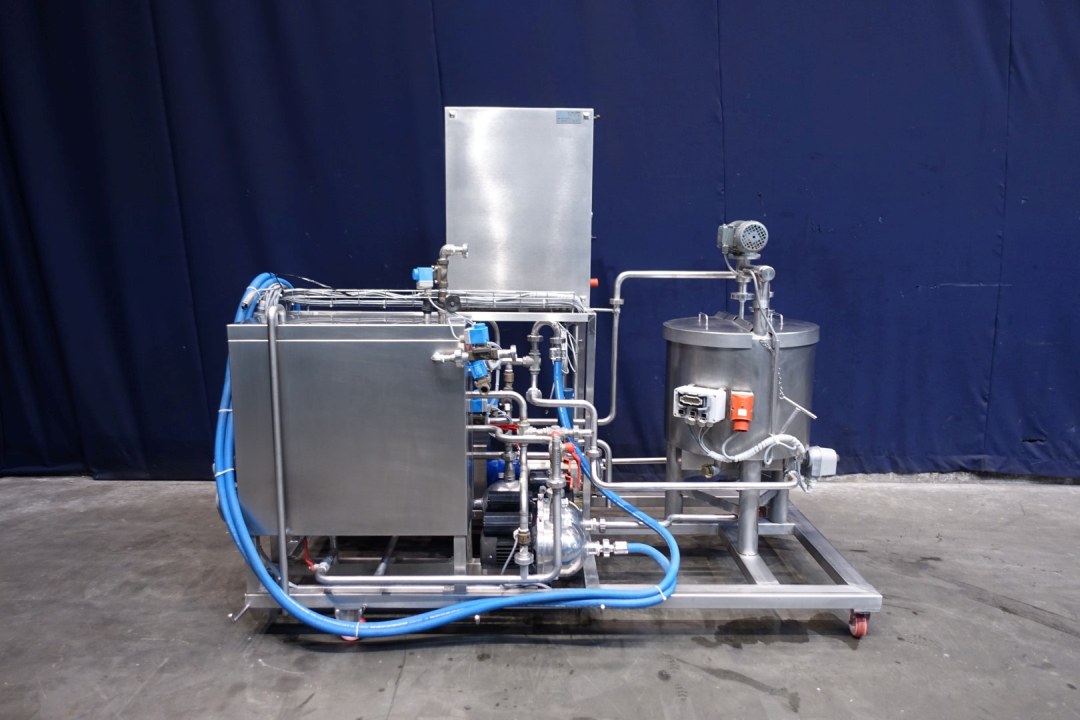 This cream pasteurisation unit suitable for producing pasteurised cream on a small scale. for heating and cooling, Mounted on SS skid, mobile on wheels. Kettle 55 ltr. with agitator, double jacketed for water circulation and insulated, with heating element 9 kW. Plate heatexchanger as cooler (Schmidt Sigma 7 NCN). Water buffer heatable. A lobbe productpump (tri lobbes) to pump the cream through the cooler, and 2 x hotwater circulation pumps and electric boiler. Can be combined with a standard 100ltr Van het Riet churn (All controls with temperature controlles and frequency drives in this unit) Documentation in Dutch available, operational manual and electrical diagrams. Total dimensions: 220x120x190 (lxwxh) cm - weight: 522 kg's.