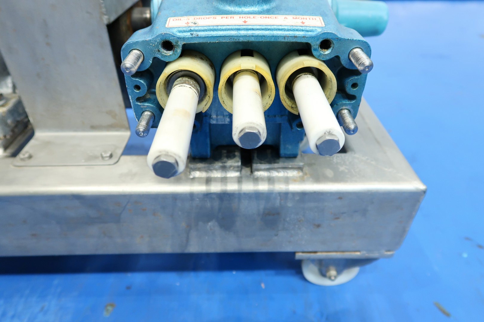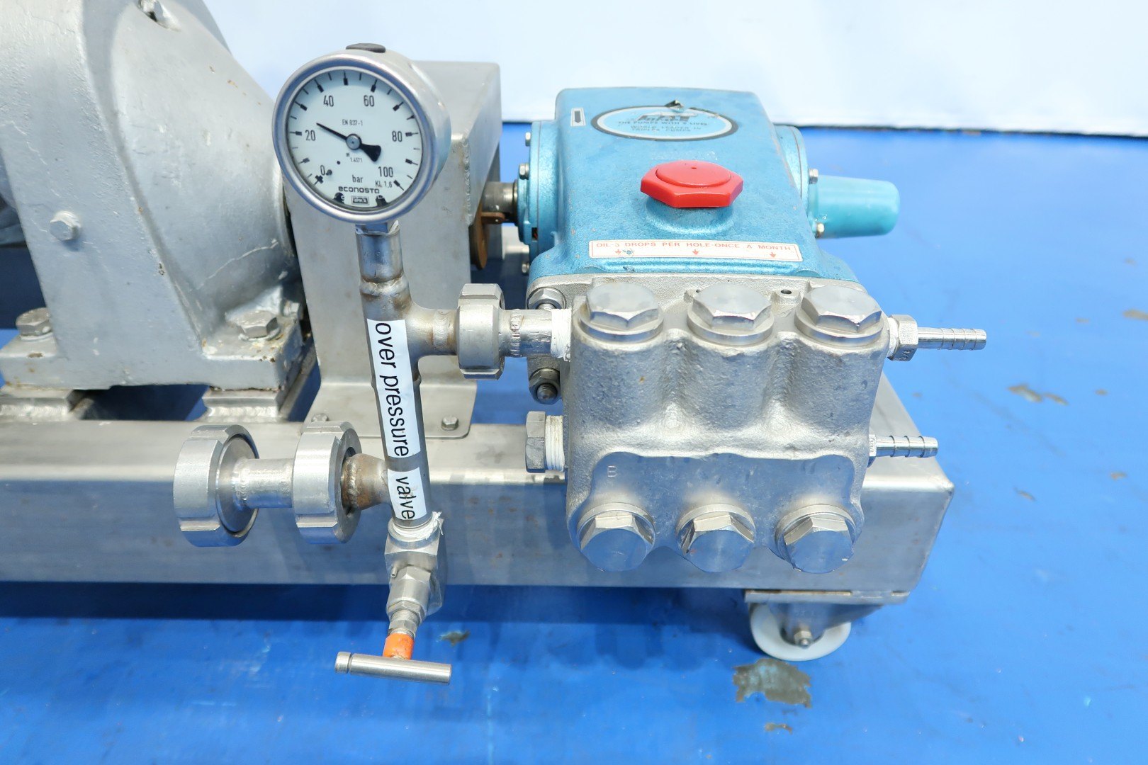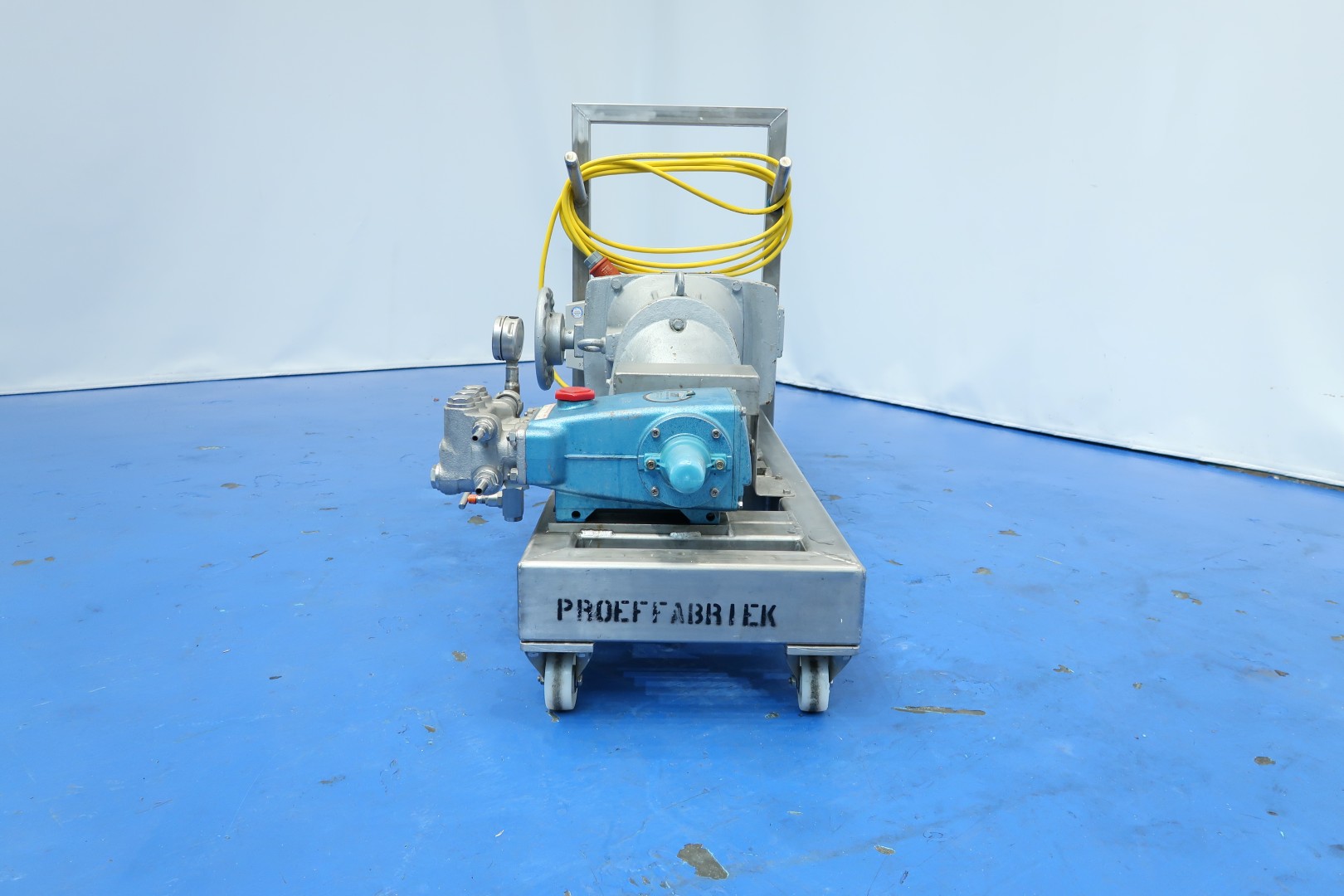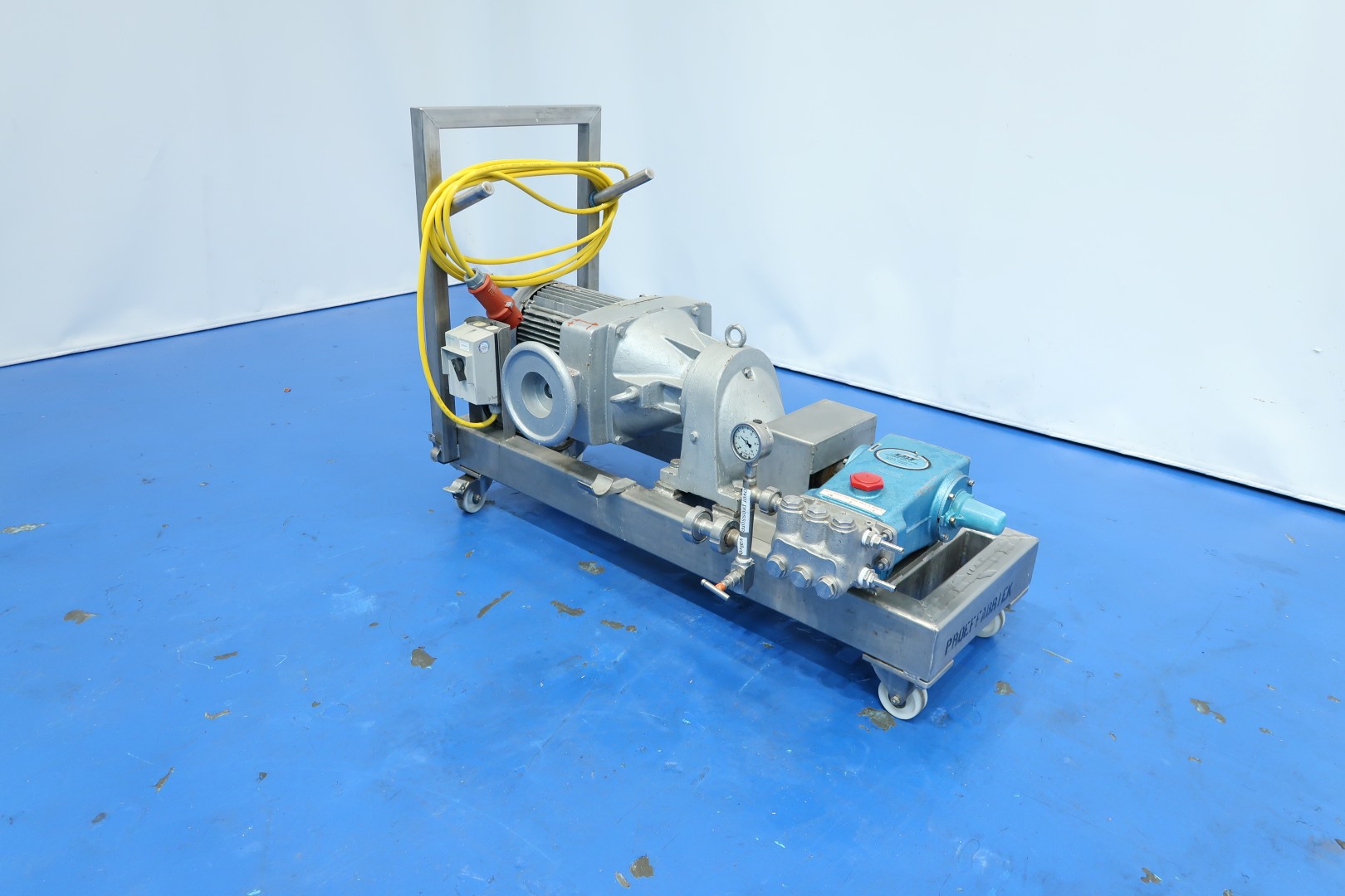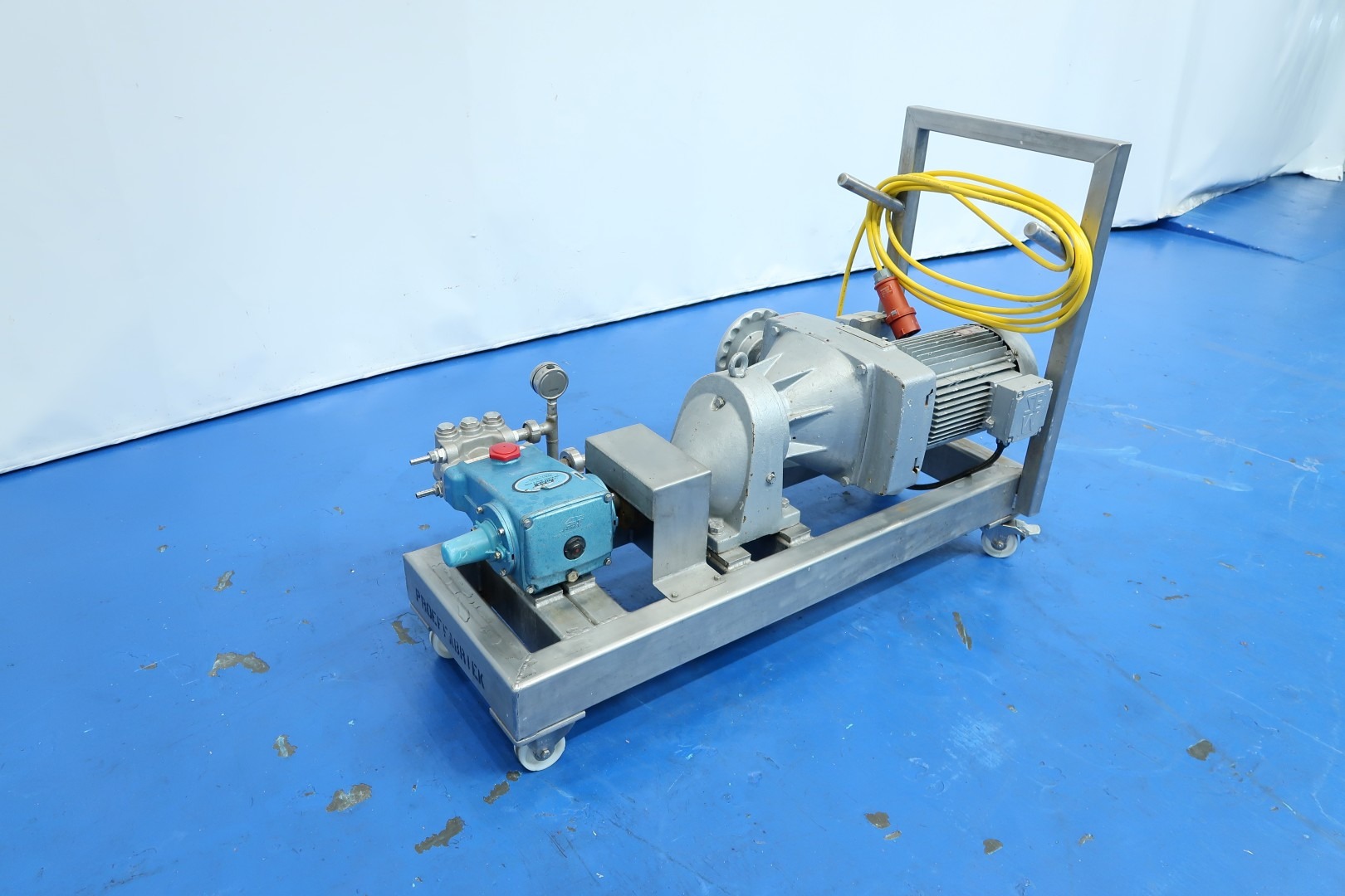 Laboratorium high pressure pump with manual reductor on mobile SS frame. Piston diameter 20 mm - length ca. 75 mm. With overpressure valve. Motor: 5,5 kW - 11,6 A - 135-665 rpm pressure estimate: 100bar (acc manometer) flow estimate: 1,000ltr/h. Total dimensions: 120x54x88 (lxwxh) cm - weight: 190 kg.