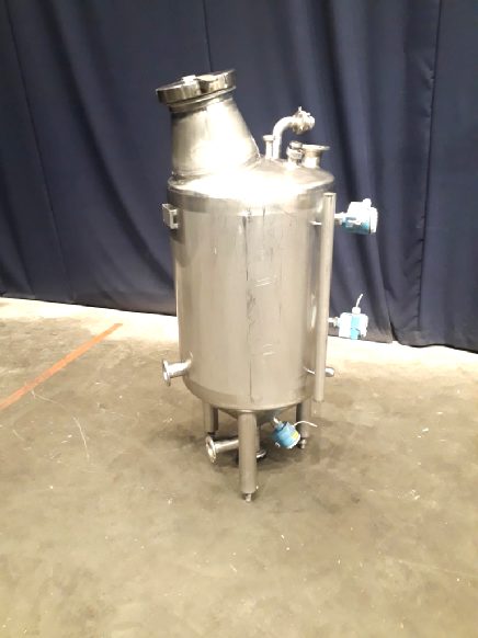 Closed vertical level tank. Pressure in tank atmospherique. Conical bottom. Product outlet 2'' DIN, outlet height: 10 cm. Connections for: PT-100 temp sensor, low level. 1 CIP spray bowl. Manhole in top, round diameter 200 mm. 3 Adjustable feet. Inside dimensions: Ø 580 mm and height 850 mm. Total dimensions: Ø 80 x 165 cm.