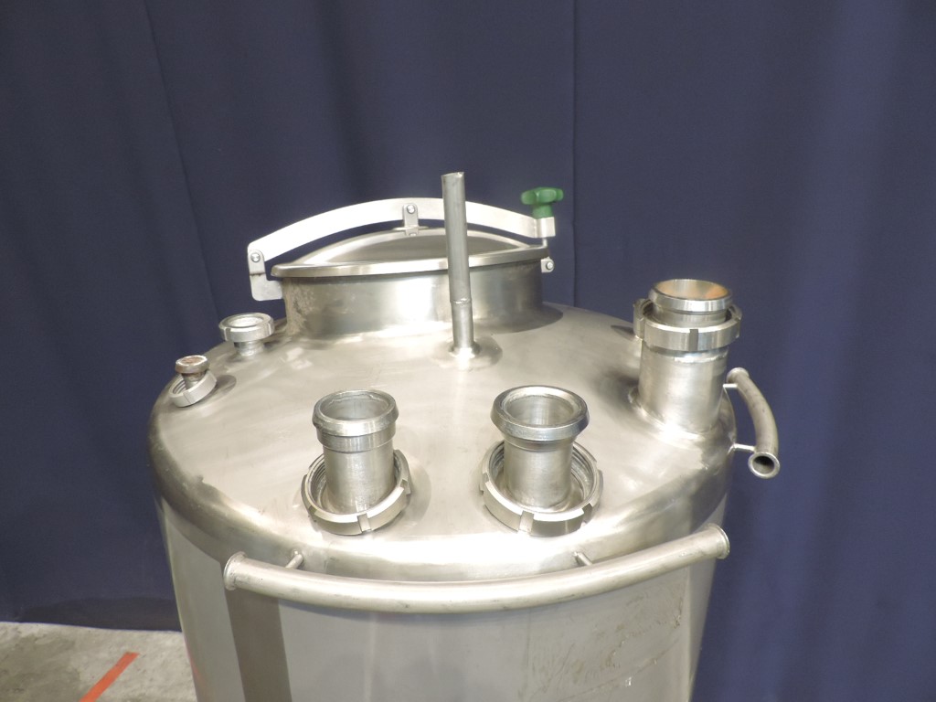 Closed vertical level tank. Pressure in tank atmospherique. Conical bottom. Product outlet 2'', outlet height: 55 cm. Connection for low level sensor. 1 CIP spray bowl. Manhole in top, round diameter 420 mm. 3 Adjustable feet. Inside dimensions: Ø 850 mm and height 1100 mm. Total dimensions: Ø 90 x 250 cm.