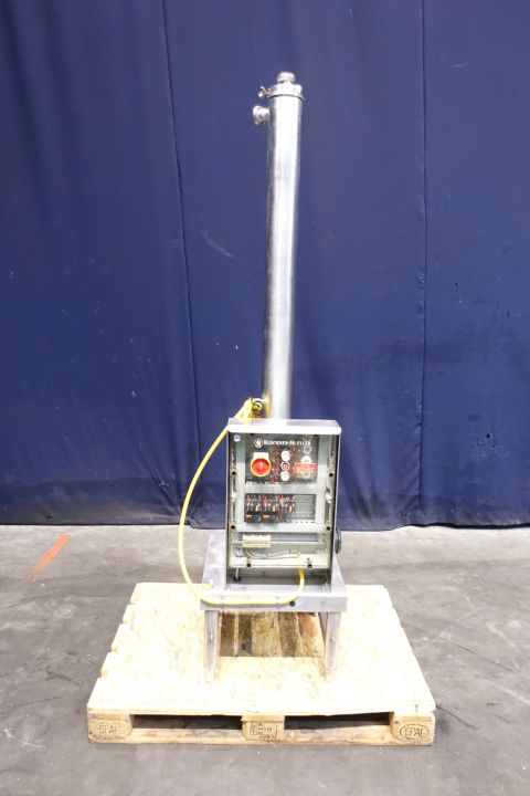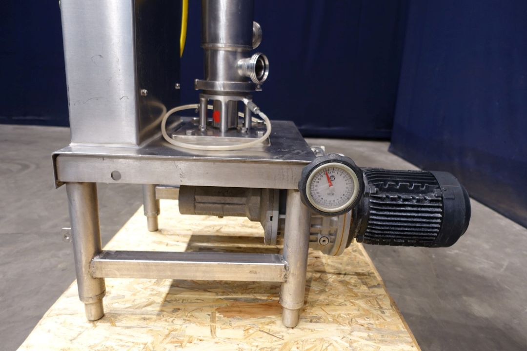 Scraped surface heatexchanger (SSHE). 1 Vertical Product cylinder, tube: Ø 96 mm, length 1.500 mm, rotor Ø 38 mm with 2 scrapers. Cylinder material: stainless steel. Surface per tube 0,19 m² and volume per tube 10,86 ltr. Electric drive motor 1,6 kW - 50 Hz - 380-420 V - 4,1 A Variable speed controlled manual reductor. Connections: 4 x 1,5" Din. For heating or cooling medium by water. With control/operation panel. Total dimensions: 85 x 57 x 210 (lxwxh) cm - weight 161 kg.