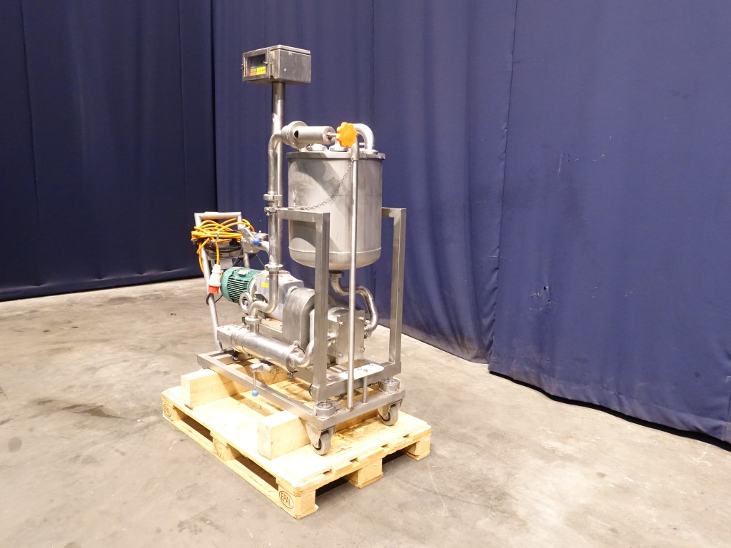 Lobbe pump with tri gummy lobbes. Diameter lobbes: 98 mm. Displacement per revolution: 0,243 ltr. Nominal capacity 8,2 m3/h. Current drive work: motor: 2,2 kW - 5,0 A - n1: 895 rpm - i= 3,5-17,6 - n2: 50 - 255 rpm. Max speed: 600 rpm. Variable speed by mechanical variator. Stainless steel cover over electric motor. Design pressure up to 6 bar. Over pressure valve. Mounted on a mobile frame with hopper (50 L). Connections: DN40, SMS. Total dimensions: 70 x 150 x 180 cm.