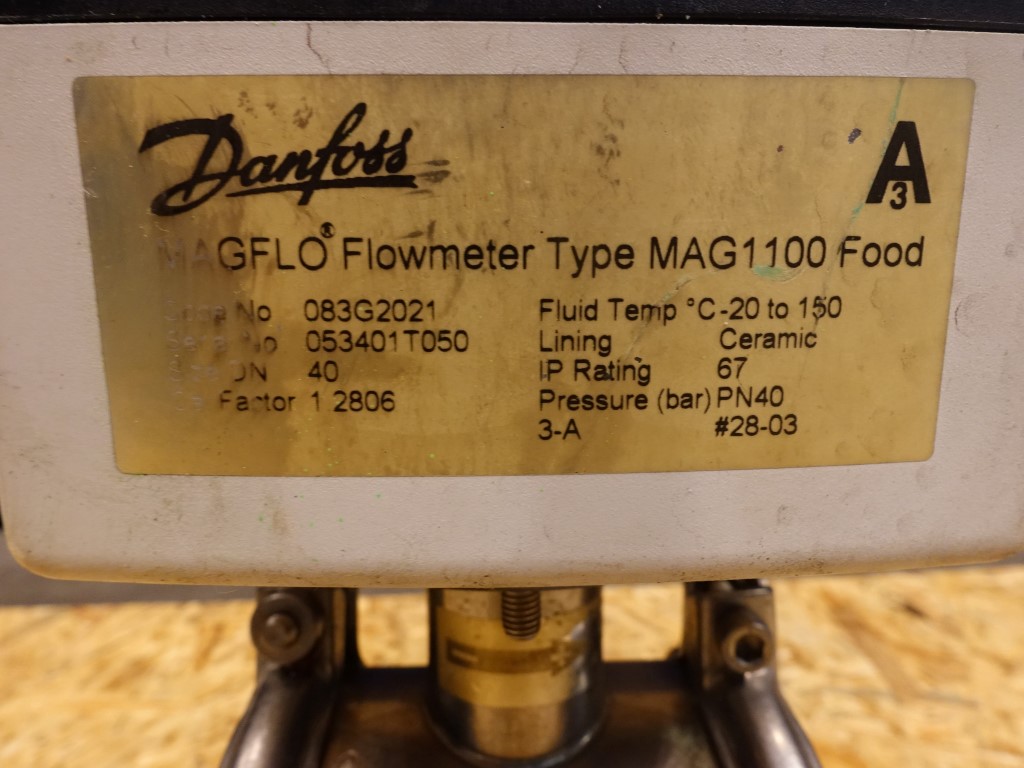 Magnetic flow transmitter MAG1100. Connections: DN40. Electronic head, Danfoss MAG6000. Code No 083F5004. Supply 24V - DC 50/60 10W.