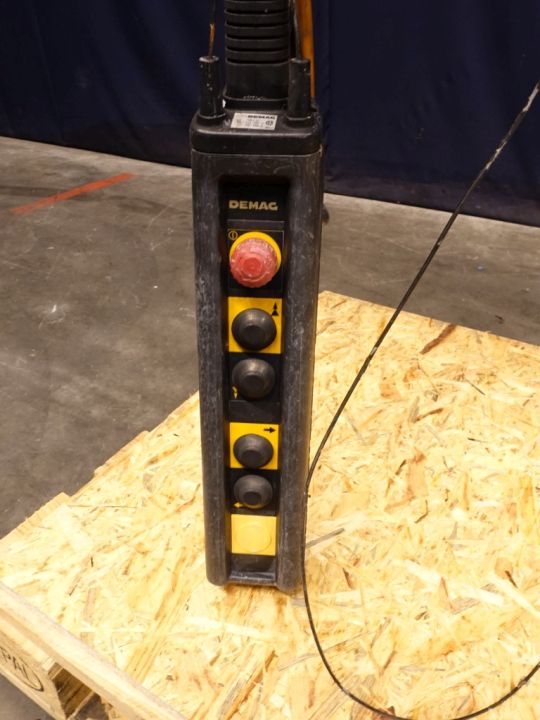 Crane previous used for lifting out the bowl of a separator. Max lifiting capacity 2.000 kg. Including push trolley. Motor power: 0,42 kW - 2,5 A - 2800 rpm.