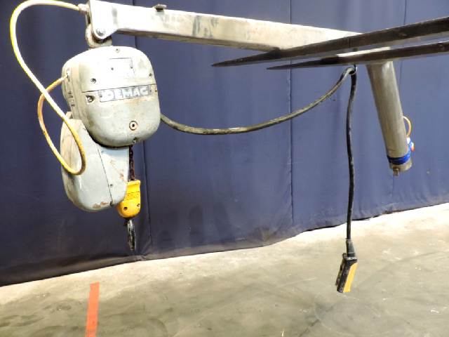 Stainless steel pole with swing arm and Demag hoist. Crane to lift out the bowl of a separator. Complete with baseframe. Lifting weight: 500 kg. Total dimensions: 200 x 160 x 360 cm.