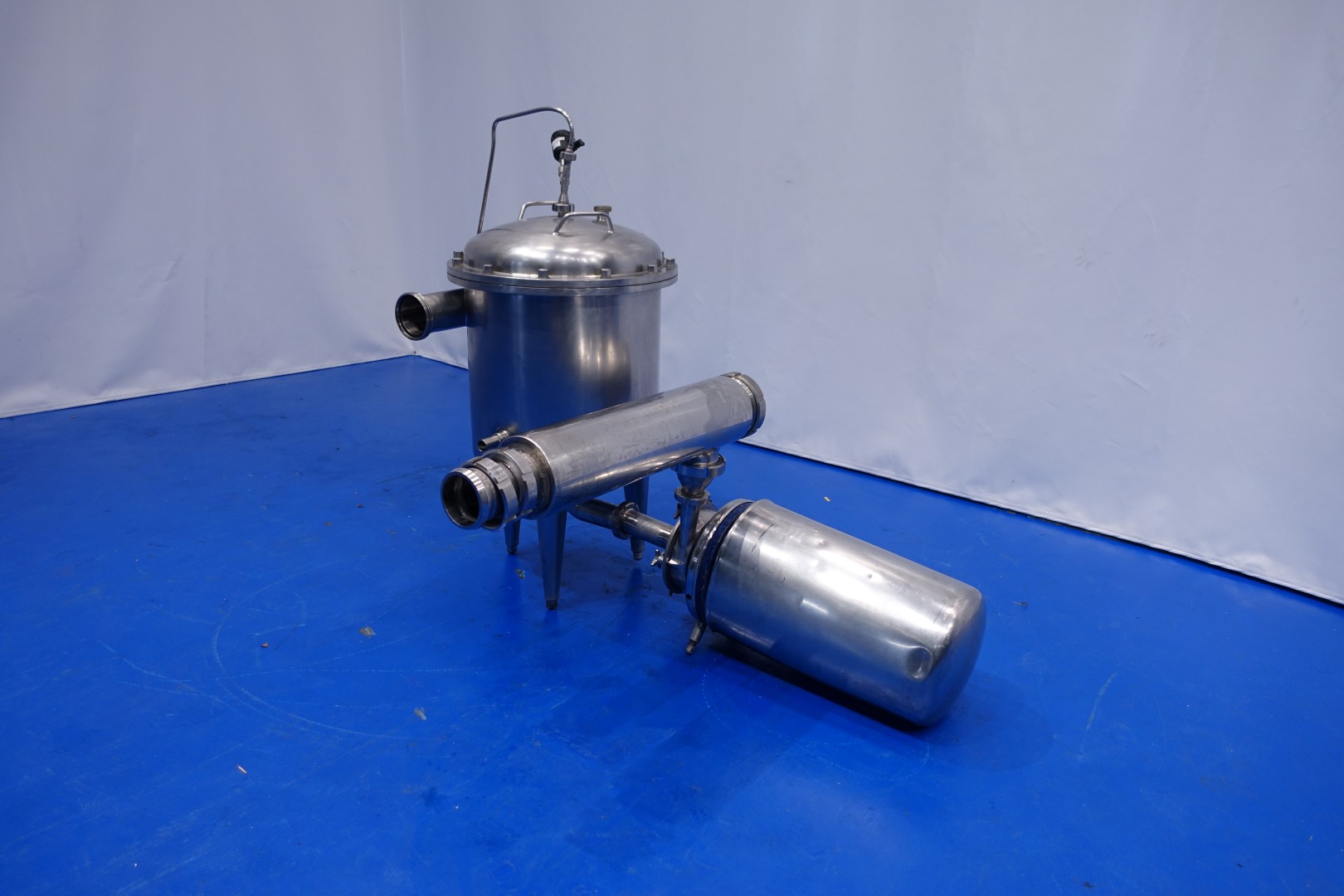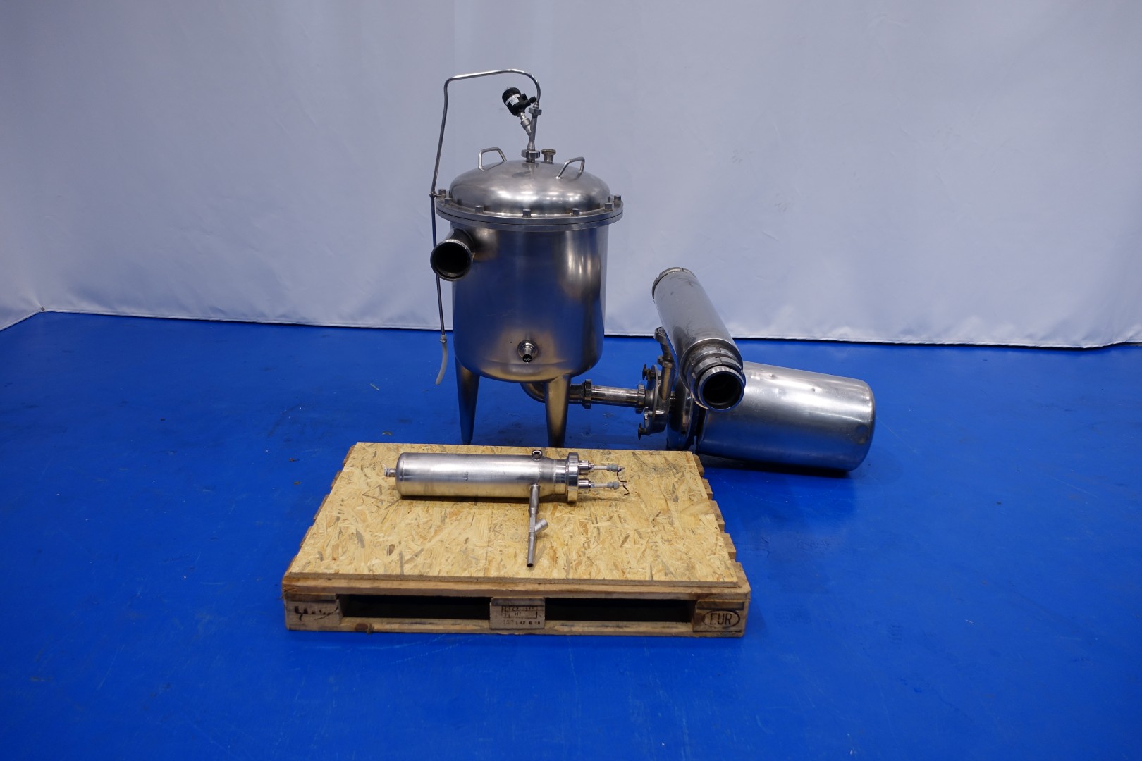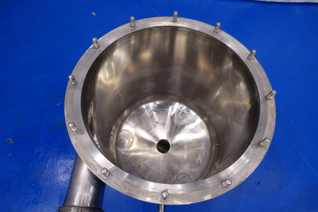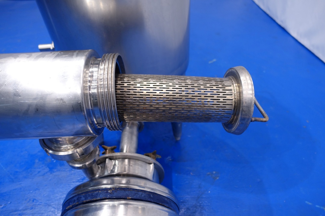 Milk reception unit with air elimination tank, pump and filter. Purpose to eliminate air to ensure accurate volume measurement before entering the flow transmitter and reception tank(s). Centrifugal pump Fristam FP742, impellor Ø 165 mm - motor 11,0 kW - 21,5 A - 2.880 rpm - 50 Hz. Connections pump In: 3" Din - Out: 2" Din. Tank capacity ca. 130 liter, dimensions Ø55 cm, height 55 cm with connections: 1 x 4" Din - 1 x 3" Din - 1 x 1" Din. Total dimensions: 100x35x42 (lxwxh) cm - weight: 245 kg.