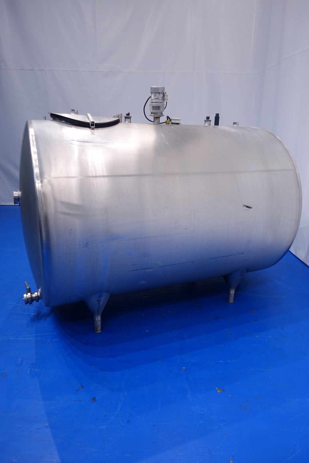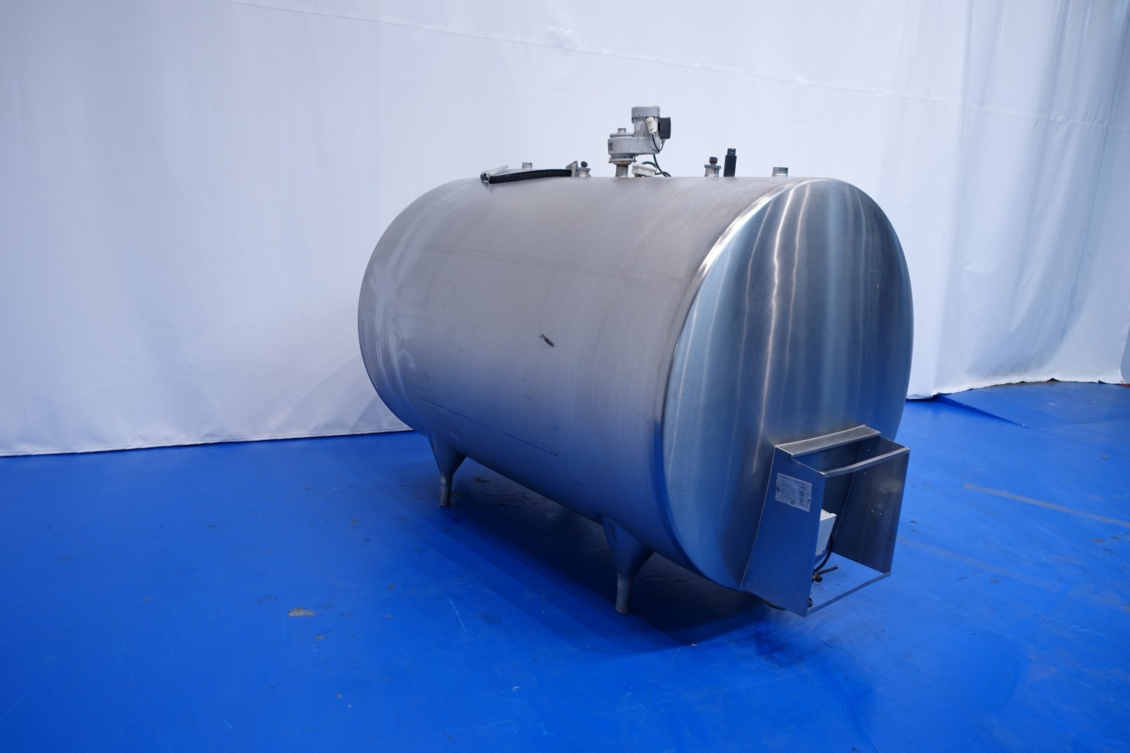 Horizontal former farm tank. Nominal volume: 2.500 liter. Without cooling compressor unit for freon but also Icewater can be connected to the jacket. Top driven propellor, motor: 133 W - n1: 2.800 rpm - n2: 25 rpm. Totally Insulated. Product outlet 2,5" Din with manual butterfly valve and outlet height: ca. 20 cm. 1x temperature gauge. 2 CIP spray bowls. With 1 x measuring rod. Manhole in top, round Ø 44cm. 4 Adjustable feet. Total dimensions: 236x144x187 cm - weight: 394 kg.