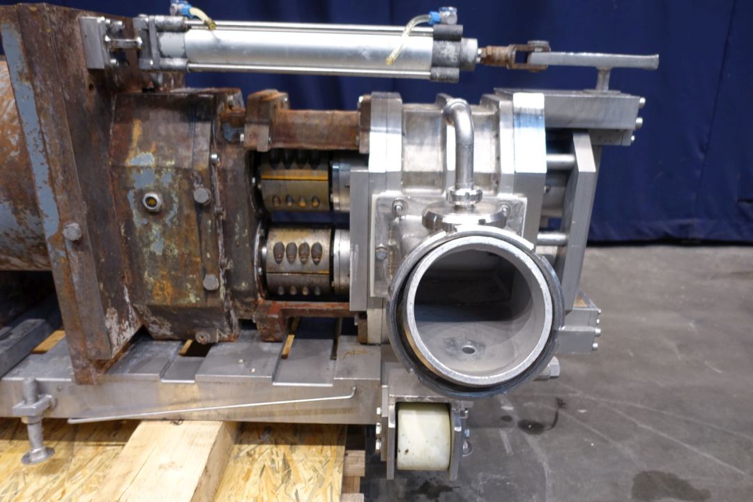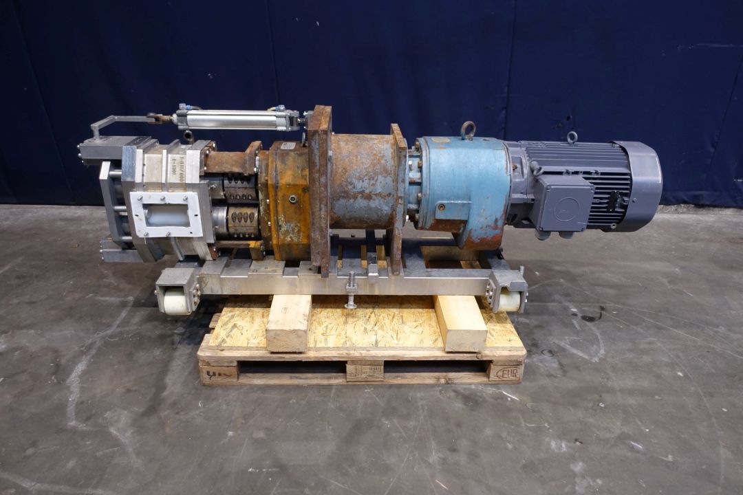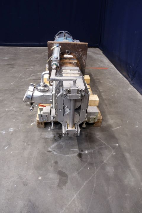 Butter lobbe pump with duo teflon lobbes. Current drive work: motor: 18,5 kW - 33,9 A - n1: 1.475 rpm, i=, n2: rpm. Cip cleanable - 1 x spray bowl. Connections: (in) 150 mm Din/ (out) rectangular flange / 1 x 1" SMS for cip-cleaning. Fabr. No. 96158. Total dimensions: 216 x 80 x 90 cm. Weight: 1.004 kg.