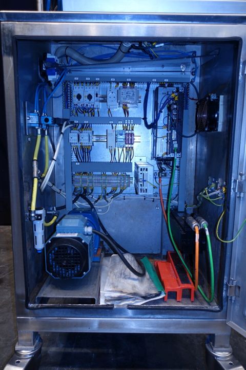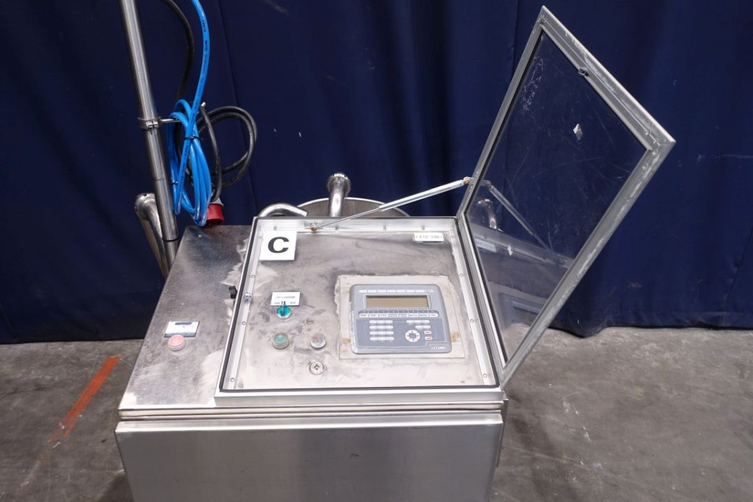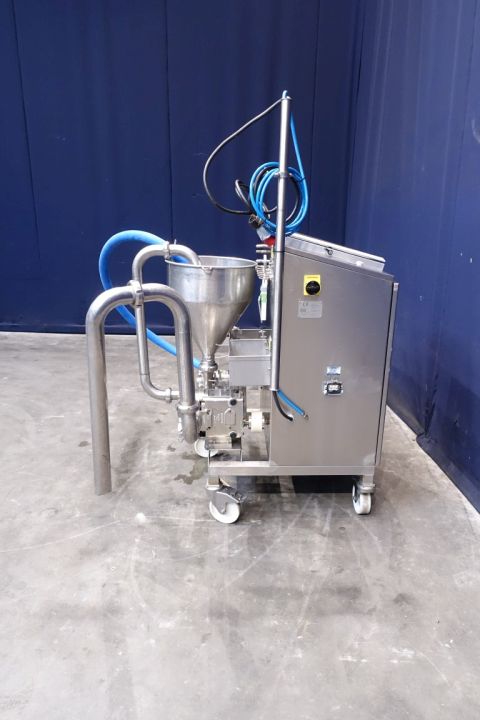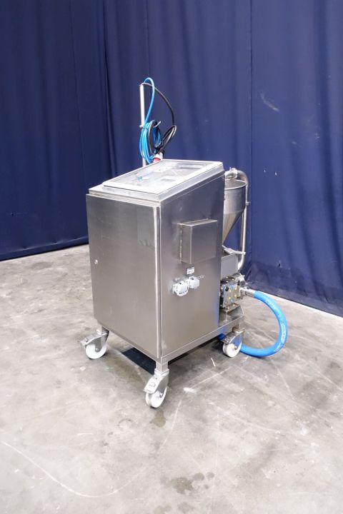 Dosing unit. a skid mounted unit with 2 pumps, 1 pump pumping the product in the hopper and 1 pump dosing the product. 1-Line. Existing out of: 2x duo lobe pumps with stainless steel lobes. (1st: Waukesha, type: 018-U1, year: 2010, serialnr 1000002455977, diameter lobbes: 85 mm, displacement per revolution: 0,12 ltr, nominal capacity: 7,5 m3/h, current drivework: servo driven: SEW Eurodrive, Movidrive, MDX61B0030-5A3-4-00, connections: DN40/DN40 SMS. 2nd: Waukesha, type 030, year: 2007, serialnr: 450679, diameter lobbes: 110 mm, displacement per revolution: 0,27 ltr, nominal capacity 15,9 m3/h, current drivework: motor 1,1 kW - n1: 2850 rpm, i: 9,09 - n2: 314 rpm, connections: DN40/DN40 SMS), hopper and control panel with operation panel. Total dimensions: 150 x 125 x 185 cm.
