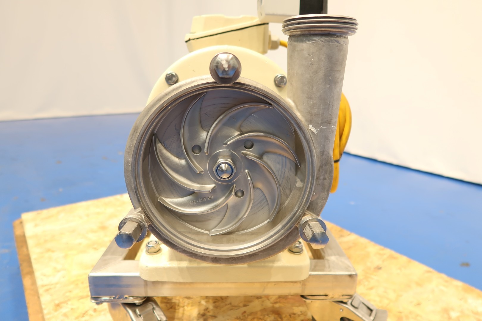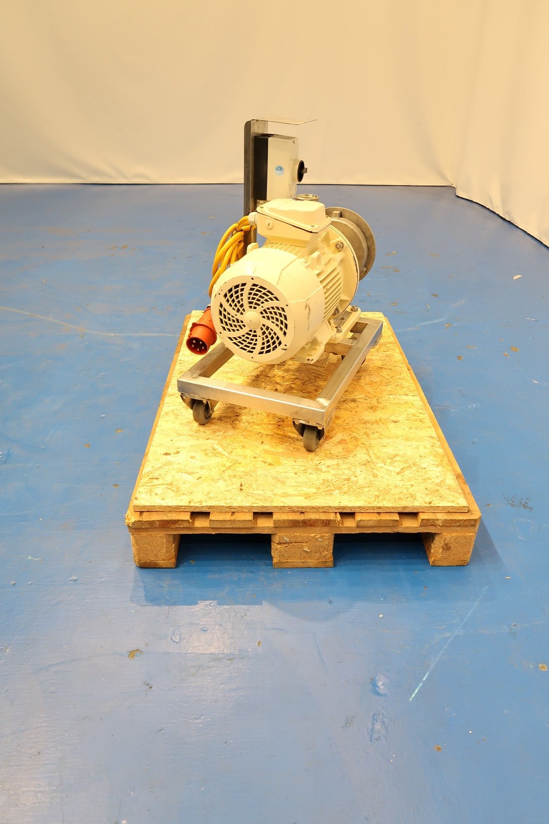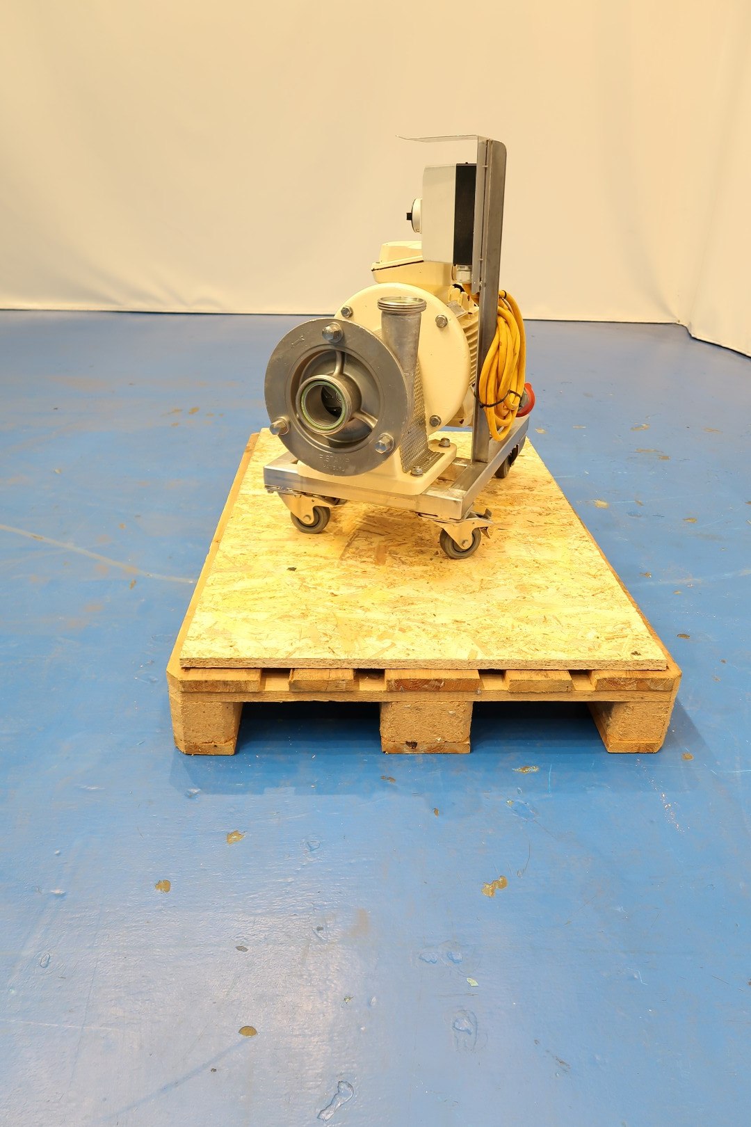 Sanitary centrifugal pump on mobile SS frame. Current motor: 7,5 kW - 14,1 A - 2.950 rpm - 50 Hz. Impellor diameter Ø 165 mm. Connections (in): 3" Din - (out): 2,5" Din. In working condition. Total dimensions: 76x40x72 (lxwxh) cm - weight: 145 kg.