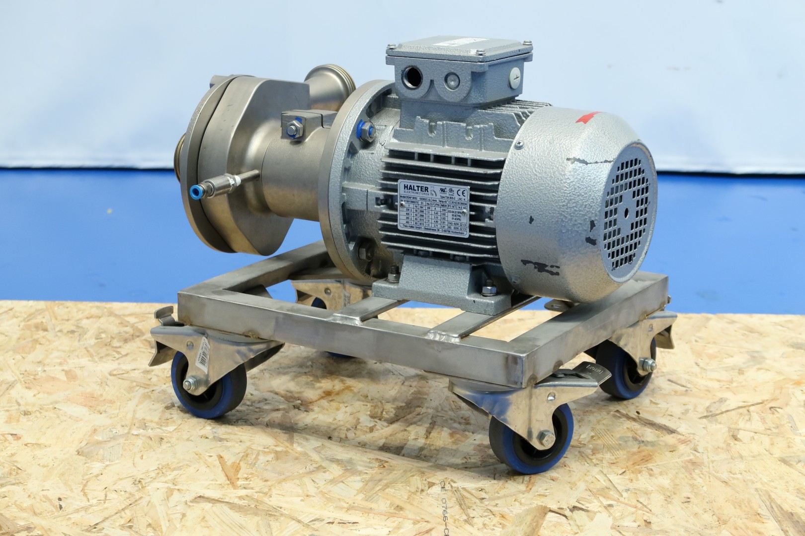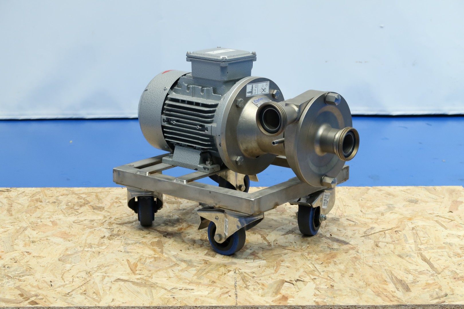 Sanitary centrifugal pump on mobile SS frame. Motor: 1,5 kW - 3,15 A - 2.900 rpm. Impellor diameter: 130 mm. Pressure: 1,7 bar. Flushed seal. Connections: (in) 2" Din / (out) 2" Din. Total dimensions: 50x33x38 (lxwxh) cm -weight: 40 kg.