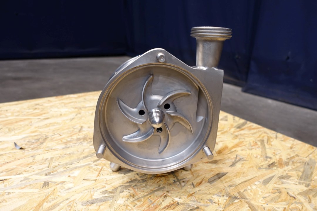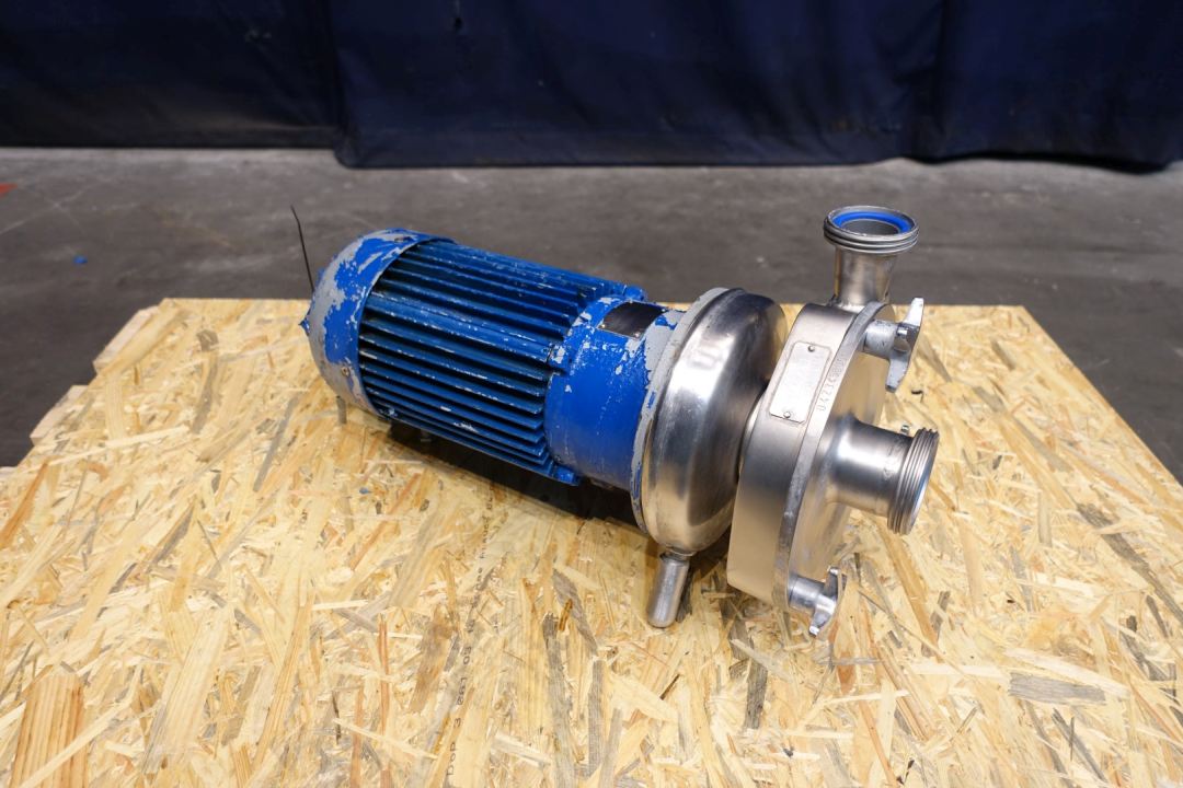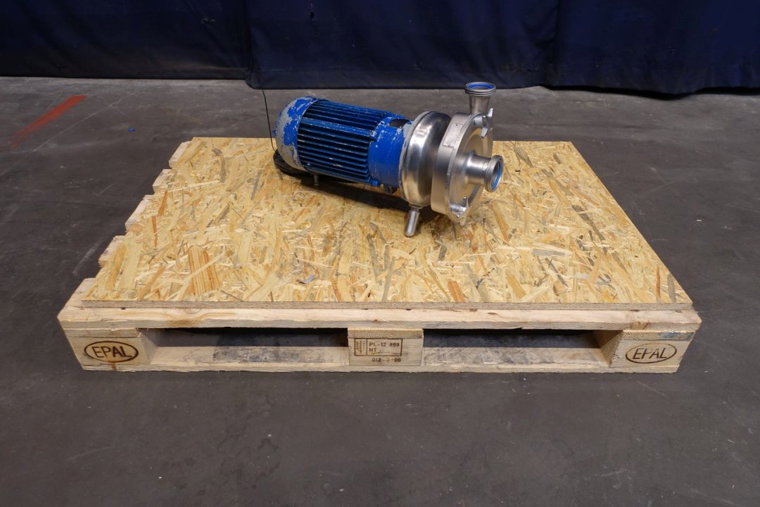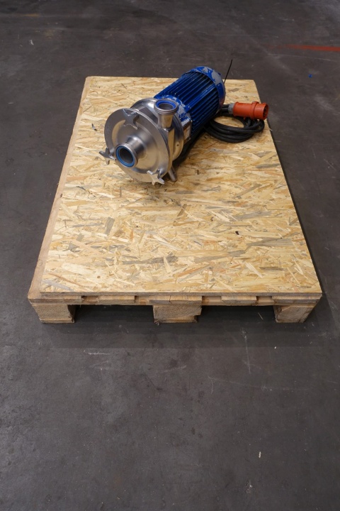 Sanitary centrifugal pump. Current motor: 3,0 kW - 6,0 A - 2.860 rpm. Impellor diameter: 145 mm. Connections: (in) 2" / (out) 1,5" DIN. Capacity approx: 20,000ltr/h at 2,5bar to 25,000ltr/h at 2,2bar Dimensions: 54x25x30 (lxwxh) cm, weight: 65,5 kg.