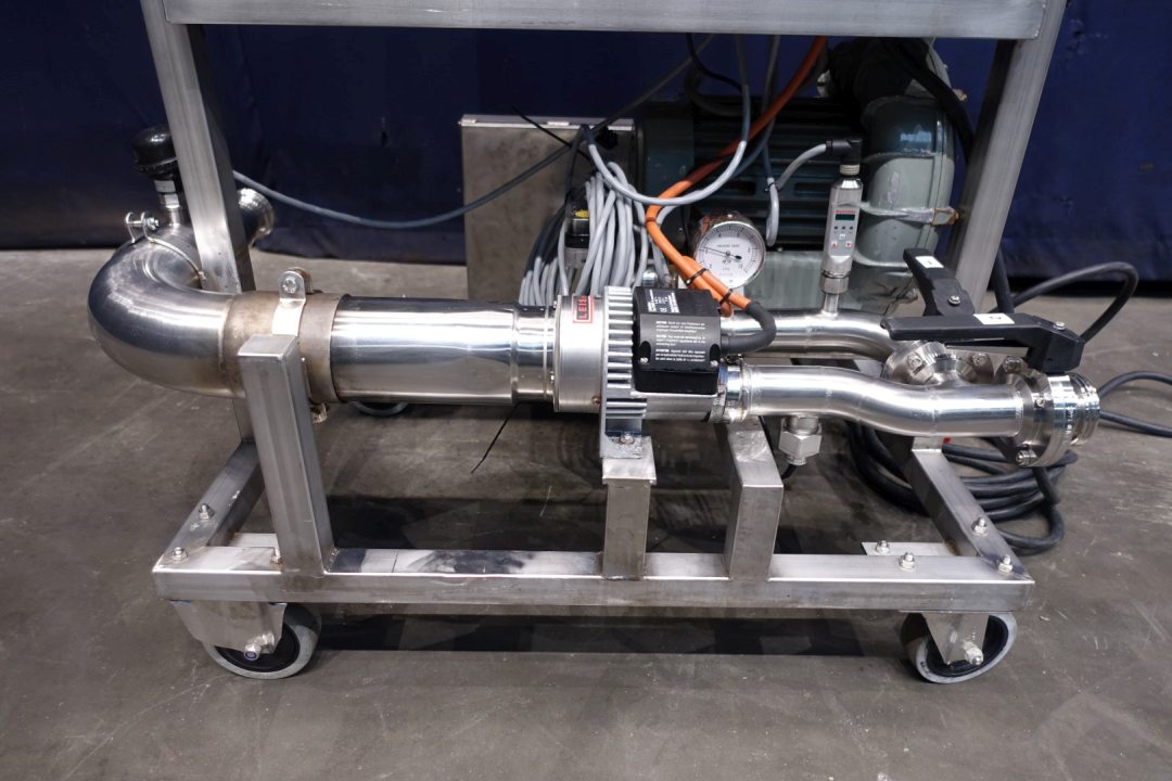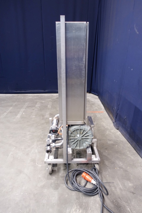 Hot air blower or mobile sterile air unit. Air blower with filter and electric air heater on SS mobile frame. Can produce hot sterile air. Built on control panel. Blower motor: 1,3 kW - 2,7 A - 50 Hz. With Leister air-heater: 3 x 22 A - 15 kW. Connections: 2 x 2" SMS. Total dimensions: 100x70x176 (lxwxh) cm, weight: 168 kg.