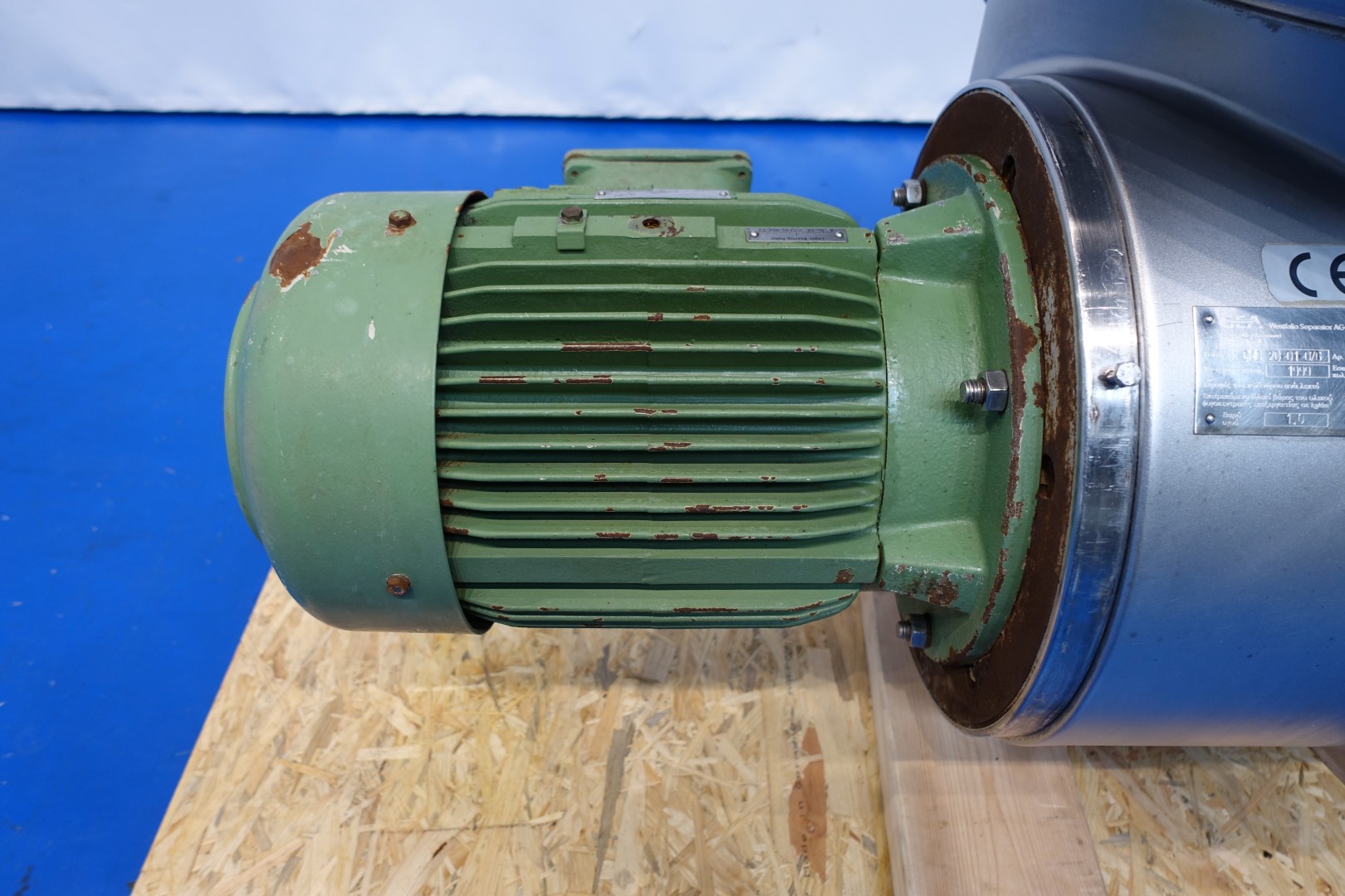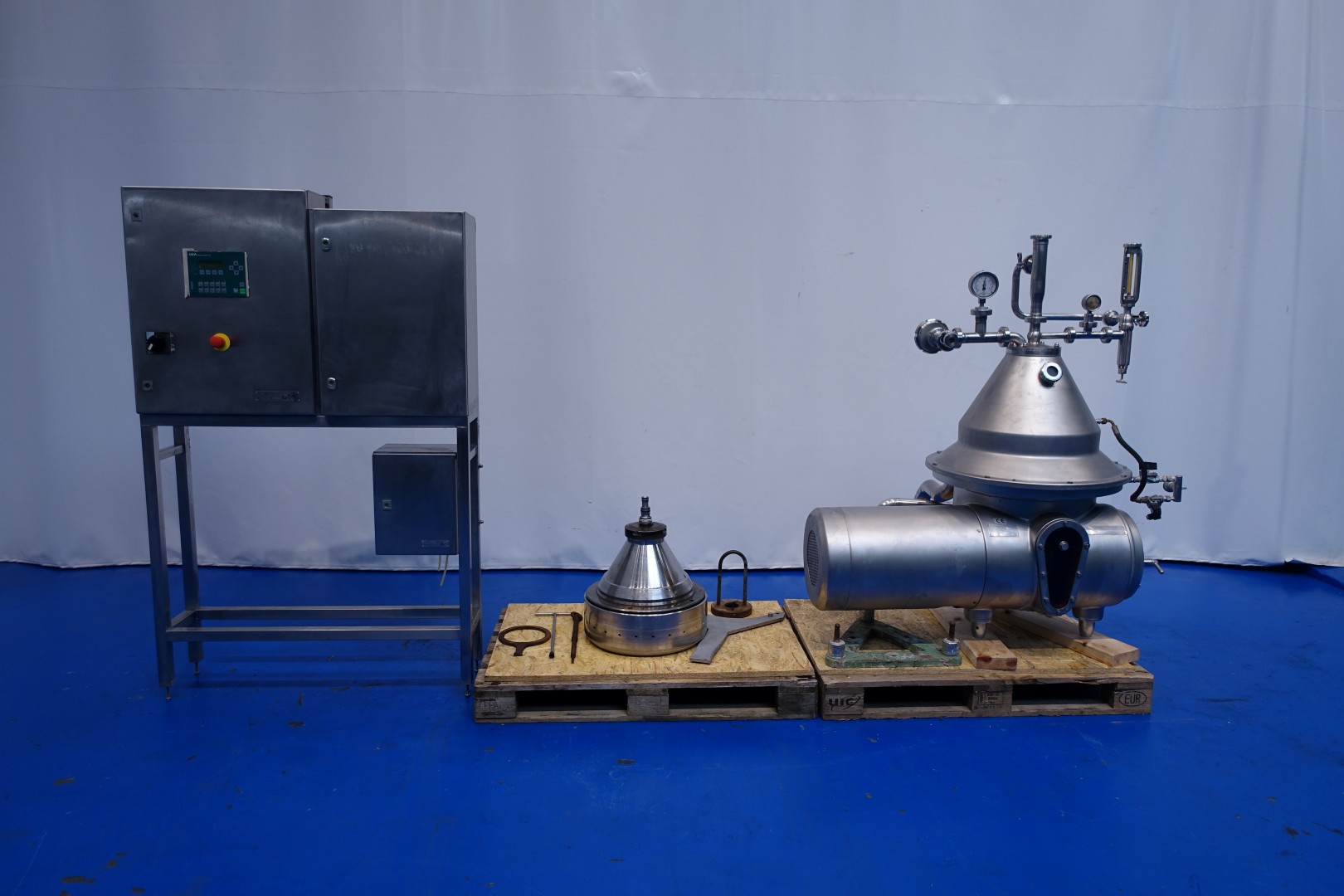 Bactofuge, self cleaning. Including bowl, bowl speed: 6.255 rpm, motor cover, base frame, pneumatic counter pressure valve milk, flowindicator and manual flow regulation valve for bactofugat with remix into the inlet. Set of manouvering water valves. Motor 7,5 kW - 15 A - 1.445 rpm. 5 Tools Ring key and lift device included. Free standing control panel with Westfalia controls. Total dimensions: 145x100x150 (lxwxh) - weight: 497 kg.