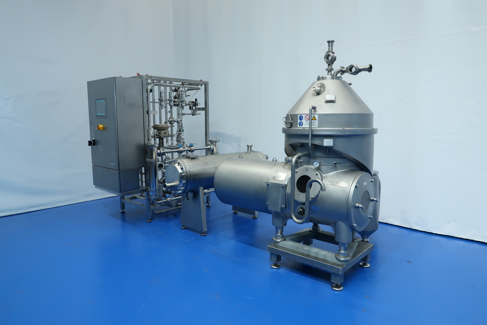 Fresh cheese - Quark - Yoghurt separator. Used for only 200hours. Nozzle separator. Dry matter adjustable by nozzle size and chosen flow between 15-21%. Input capacity of fermented skim milk 0% up to 5.400 liters per hour. Output capacity up to 1.100 kg per hour (at 18%). Max bowl speed: 6.000 rpm - solids 1,1 kg/dm3. The separator separates fermented skim milk in heavy phase, whey and light phase curd / yoghurts to concentrate the protein by a nozzle system. Ratio of input and output between 2 and 3 liter for 1 liter of concentrated end product. CIP cleanable. 6 Nozzles 0,6 mm in bowl. Including: A stainless steel skid with auxiliary equipment for the separator with on inlet milk Double filters with valves, Flow transmitter and feed flow control valve. On whey out, counter pressure, flow transmitter, valves, Sterile air filters (steam able), cooling water valves and sensors. on product outlet Product collecting hoppper. apart from the unit a Tubular product cooler GEA-Westfalia model: C1000, Foundation frame, complete set tools, and set spare parts (with 2 sets nozzles 0,6mm and 0,7mm). Closed design with sterile air filter and for extended shelf life of product. Controls: Start-delta motor starter, CPU Siemens Simatic S7 plc with touch screen hmi panel. Documentation: instruction manual, partslist and technical drawings available.