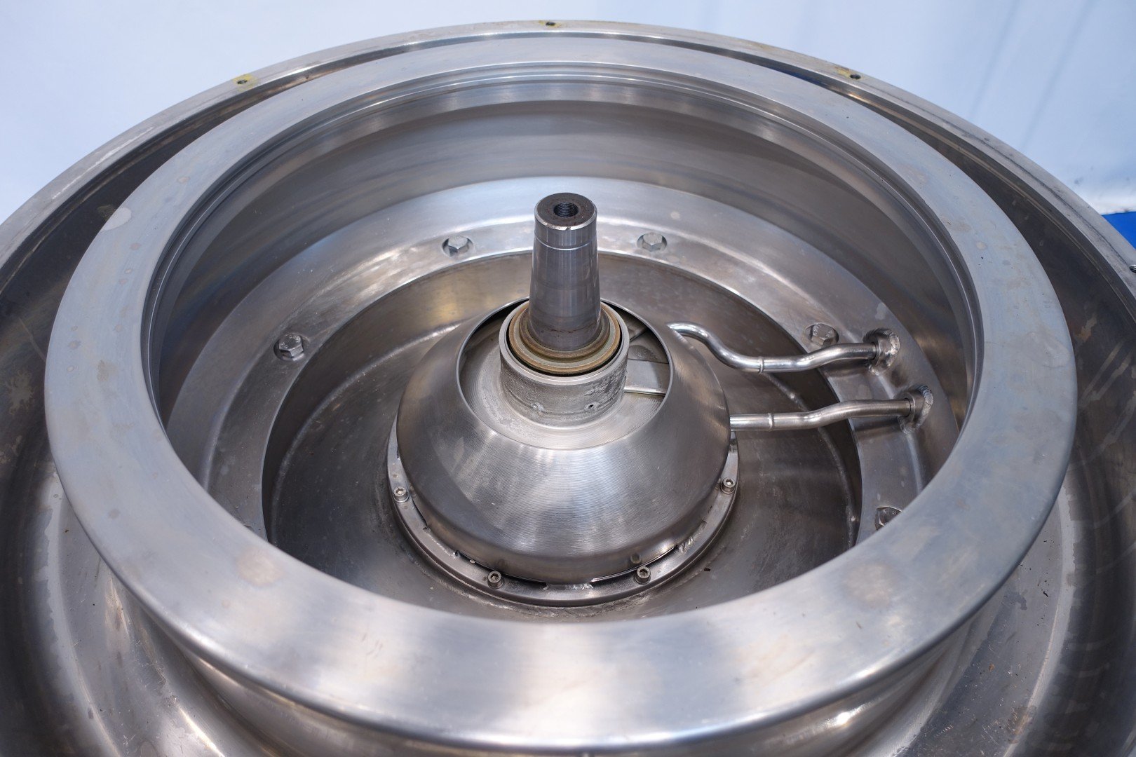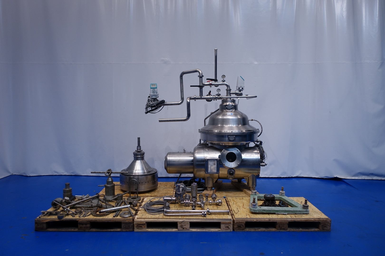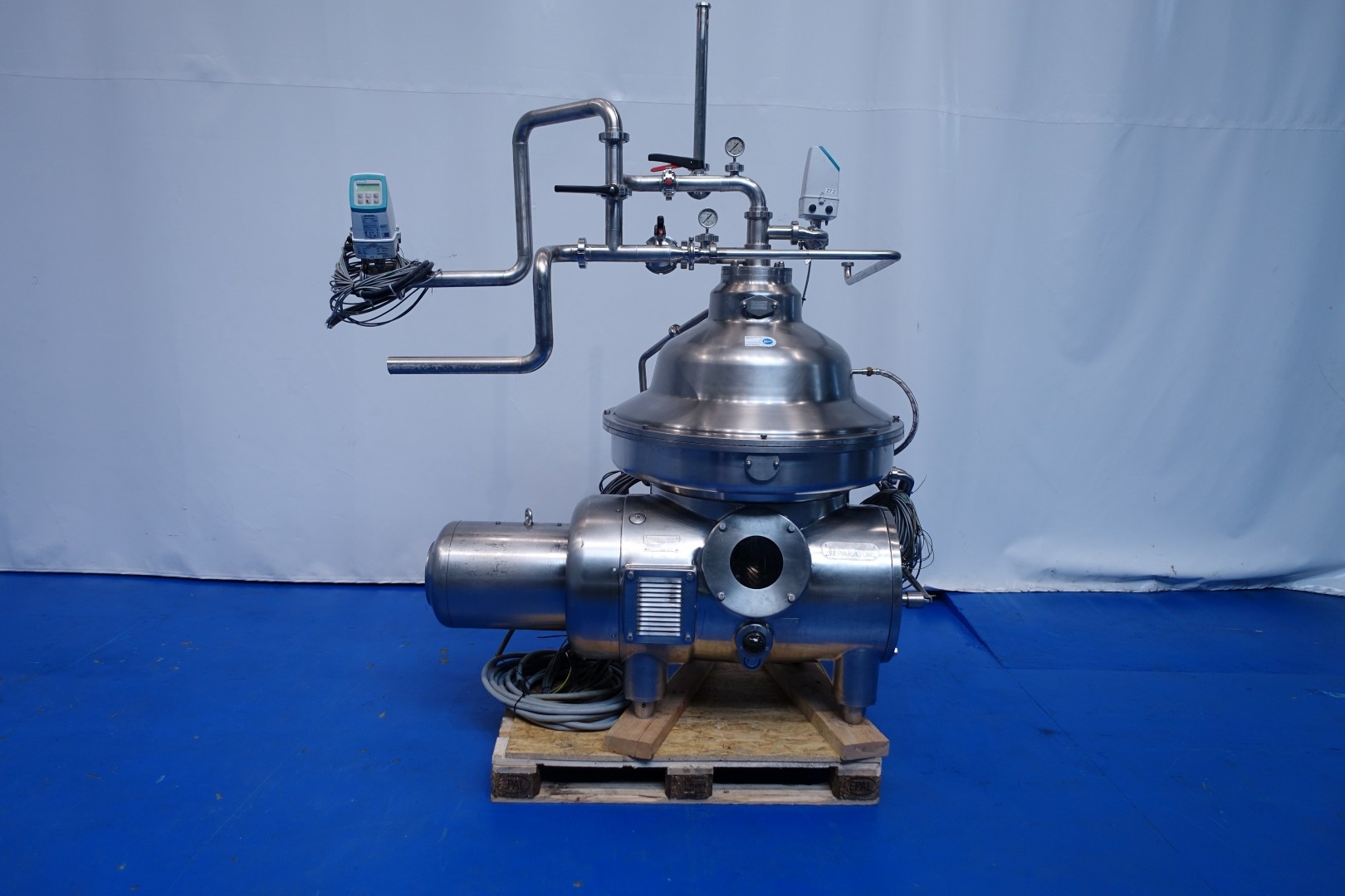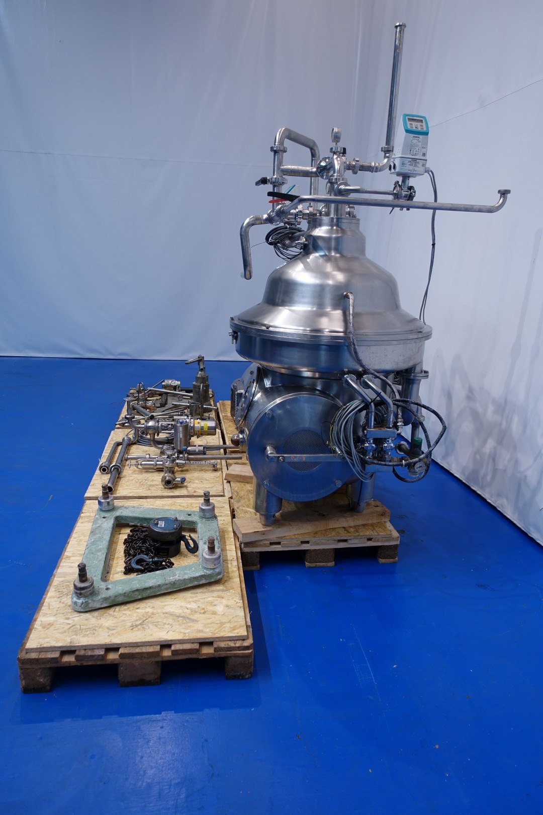 Milk and whey skimmer/separator. Self cleaning. Including bowl, motor cover, base frame, pneumatic counter pressure valve milk , E&H flowmeter on infeed and E&H flowmeter on cream outfeed. Automatic flow regulation valve for cream, manouvering water valves. With by-pass for cleaning (special design for whey and milk). Motor 18,5 kW. Fluid clutch. Bowl speed 5.920 rpm - solids 1,1 kg/dm3. Set of tools with ring key, pressing tool and 500 kg chain hoist. Controls centralized in panel of Pasteurizing unit (STN15758). Total dimensions ca. 175x135x235 (lxwxh) cm - weight: 2.079 kg.